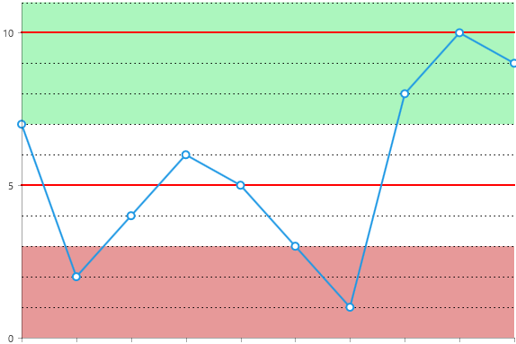 <div id="chart" data-win-control="Telerik.UI.RadChart" data-win-options="{ theme: 'light', series: [{ type: 'line', data: [7, 2, 4, 6, 5, 3, 1, 8, 10, 9] }], valueAxis: { plotBands: [ { from: 0, to: 3, color: 'rgba(194, 0, 0, 0.4)' }, { from: 7, to: 12, color: 'rgba(48, 233, 92, 0.4)' } ], min: 0, max: 11, majorUnit: 5, minorUnit: 1, majorGridLines: { visible: true, dashType: 'solid', width: 2, color: 'red' }, minorGridLines: { visible: true, dashType: 'dot' } } }" style="width: 600px"></div>In the above configuration, we show the minor grid lines and make them look like the regular major grid lines. At the same time, we set a major unit of 5, thus, making the major grid lines show on values 5, 10, 15, etc. Additionally, we make the major grid lines stand out through solid stroke and red color. The result is a distinctive set of major grid lines at regular intervals:
