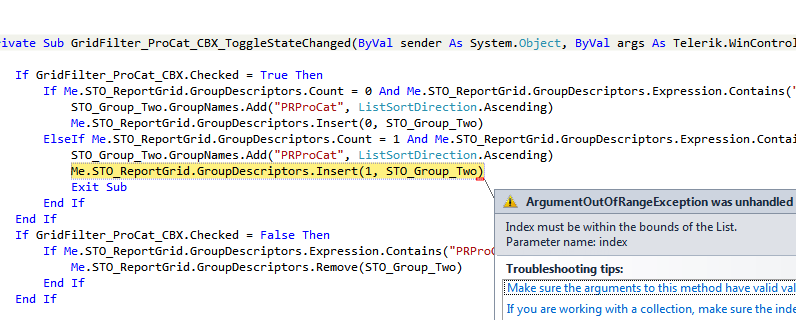 Dim STO_Group_One As New GroupDescriptor() Dim STO_Group_Two As New GroupDescriptor() Private Sub GridFilter_ProName_CBX_ToggleStateChanged(ByVal sender As System.Object, ByVal args As Telerik.WinControls.UI.StateChangedEventArgs) Handles GridFilter_ProName_CBX.ToggleStateChanged If GridFilter_ProName_CBX.Checked = True Then If Me.STO_ReportGrid.GroupDescriptors.Count = 0 And Me.STO_ReportGrid.GroupDescriptors.Expression.Contains("PRProName") = False Then STO_Group_One.GroupNames.Add("PRProName", ListSortDirection.Ascending) Me.STO_ReportGrid.GroupDescriptors.Insert(0, STO_Group_One) ElseIf Me.STO_ReportGrid.GroupDescriptors.Count = 1 And Me.STO_ReportGrid.GroupDescriptors.Expression.Contains("PRProName") = False Then STO_Group_One.GroupNames.Add("PRProName", ListSortDirection.Ascending) Me.STO_ReportGrid.GroupDescriptors.Insert(1, STO_Group_One) Exit Sub End If Else End If If GridFilter_ProName_CBX.Checked = False Then If Me.STO_ReportGrid.GroupDescriptors.Expression.Contains("PRProName") = True Then Me.STO_ReportGrid.GroupDescriptors.Remove(STO_Group_One) End If End If End Sub Private Sub GridFilter_ProCat_CBX_ToggleStateChanged(ByVal sender As System.Object, ByVal args As Telerik.WinControls.UI.StateChangedEventArgs) Handles GridFilter_ProCat_CBX.ToggleStateChanged If GridFilter_ProCat_CBX.Checked = True Then If Me.STO_ReportGrid.GroupDescriptors.Count = 0 And Me.STO_ReportGrid.GroupDescriptors.Expression.Contains("PRProCat") = False Then STO_Group_Two.GroupNames.Add("PRProCat", ListSortDirection.Ascending) Me.STO_ReportGrid.GroupDescriptors.Insert(0, STO_Group_Two) ElseIf Me.STO_ReportGrid.GroupDescriptors.Count = 1 And Me.STO_ReportGrid.GroupDescriptors.Expression.Contains("PRProCat") = False Then STO_Group_Two.GroupNames.Add("PRProCat", ListSortDirection.Ascending) Me.STO_ReportGrid.GroupDescriptors.Insert(1, STO_Group_Two) Exit Sub End If End If If GridFilter_ProCat_CBX.Checked = False Then If Me.STO_ReportGrid.GroupDescriptors.Expression.Contains("PRProCat") = True Then Me.STO_ReportGrid.GroupDescriptors.Remove(STO_Group_Two) End If End If End Sub Private Sub STO_ReportGrid_Click(ByVal sender As System.Object, ByVal e As System.EventArgs) Handles STO_ReportGrid.GroupByChanging On Error Resume Next If Me.STO_ReportGrid.GroupDescriptors.Expression.Contains("PRProName") = True Then Me.GridFilter_ProName_CBX.Checked = False ElseIf Me.STO_ReportGrid.GroupDescriptors.Expression.Contains("PRProCat") = True Then Me.GridFilter_ProCat_CBX.Checked = False End If End Sub0