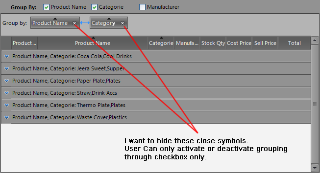 If GridFilter_ProName_CBX.Checked = True Then If Me.STO_ReportGrid.GroupDescriptors.Count = 0 And Me.STO_ReportGrid.GroupDescriptors.Expression.Contains("PRProName") = False Then STO_Group_One.GroupNames.Add("PRProName", ListSortDirection.Ascending) Me.STO_ReportGrid.GroupDescriptors.Insert(0, STO_Group_One) ElseIf Me.STO_ReportGrid.GroupDescriptors.Count = 1 And Me.STO_ReportGrid.GroupDescriptors.Expression.Contains("PRProName") = False Then STO_Group_One.GroupNames.Add("PRProName", ListSortDirection.Ascending) Me.STO_ReportGrid.GroupDescriptors.Add(STO_Group_One) Exit Sub End IfElseEnd IfTo remove close buttons from the GroupPanel you can process the GroupChanged event and collapse all RemoveButton instances: