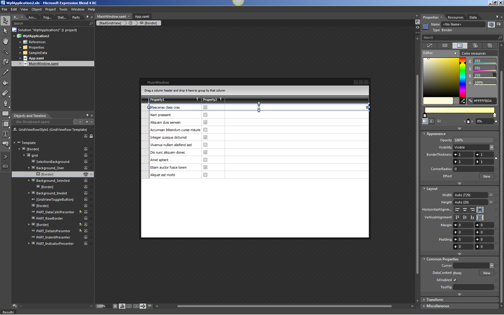 I'm having trouble for customize the colors of mouseover color and selected color in Expression Blend 4.