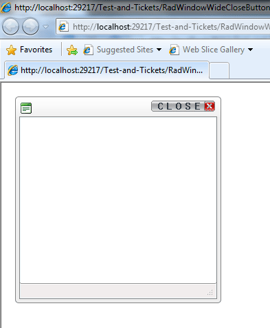 <%@ Register TagPrefix="telerik" Namespace="Telerik.Web.UI" Assembly="Telerik.Web.UI" %><!DOCTYPE html PUBLIC "-//W3C//DTD XHTML 1.0 Strict//EN" "http://www.w3.org/TR/xhtml1/DTD/xhtml1-strict.dtd"><html xmlns="http://www.w3.org/1999/xhtml"><head runat="server"> <title></title> <style type="text/css"> .rwControlButtons, .rwTitlebarControls em { display: inline-block; zoom: 1; *display: inline; width: auto !important; *width: 145px !important; } .rwCloseButton { position: relative; top: 0px; right: 4px; background-image: url(closereport_button.png) !important; background-position: 0 0 !important; width: 112px !important; height: 22px !important; } .rwCloseButton:hover { background: url(closereport_button.png) 0 -20px !important; } </style></head><body> <form id="form1" runat="server"> <asp:ScriptManager ID="ScriptManager1" runat="server"> </asp:ScriptManager> <telerik:RadWindow ID="SummaryRadWindow" runat="server" Behaviors="Close, Maximize, Reload" Height="300px" Title="Win Title" Width="400px" VisibleOnPageLoad="true"> <ContentTemplate> Lorem ipsum dolor sit amet, consectetur adipiscing elit. Suspendisse eu nisl eget erat elementum porttitor eget sed dui. Curabitur non tristique quam. Pellentesque habitant morbi tristique senectus et netus et malesuada fames ac turpis egestas. Maecenas lorem enim, pellentesque sed congue at, tincidunt ut justo. </ContentTemplate> </telerik:RadWindow> <br /> <br /> <br /> </form></body></html>Attached is closereport_button.png used in my example with height of 22px, if you use different height, you should modify the styles for the hover state.