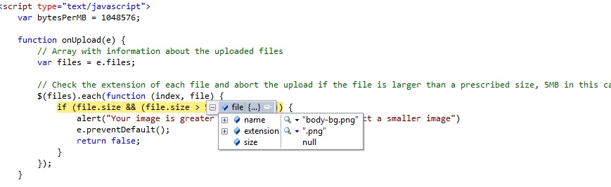 var bytesPerMB = 1048576;function onUpload(e) { // Array with information about the uploaded files var files = e.files; // Check the extension of each file and abort the upload if the file is larger than a prescribed size, 5MB in this case $(files).each(function (index, file) { if (file.size && (file.size > 5 * bytesPerMB)) { alert("Your image is greater than 5MB in size. Please select a smaller image") e.preventDefault(); return false; } });}I tried your code but it returns a file size of null as per the attached picture. I am using MVC 3 version for 2011 Q1. Please would you help.