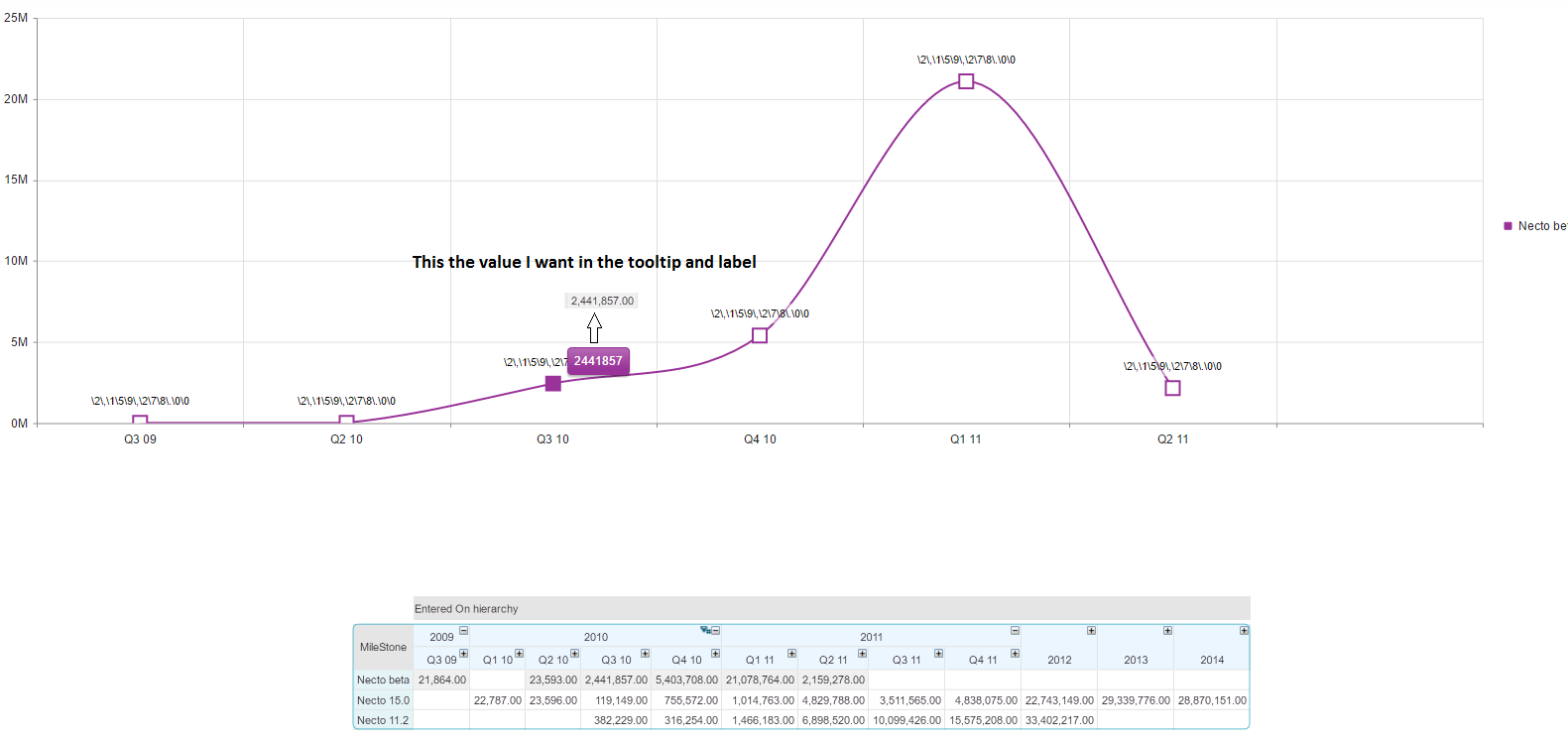 I have an array of values I load into the chart (series data) , and another array with the same formatted values that I want to represent in the tooltip and label.