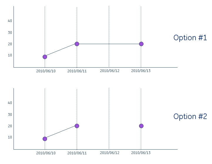 2: is to set fake value ex: 0 and try to show that point differently. For example setting different label like in Meteo Chart with devil icons for fake data.
