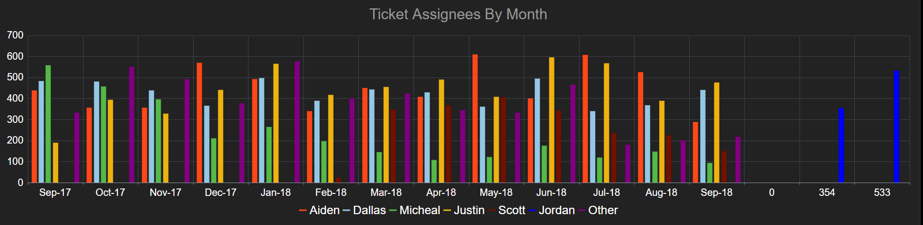 We have a Kendo Column chart that we are using to display the number of tickets assigned to an individual per month for the rolling 13 months. I recently added a new employee to the list (Jordan), and now the chart is not forming correctly, and I can't seem to find my error. Please see attached screenshots.