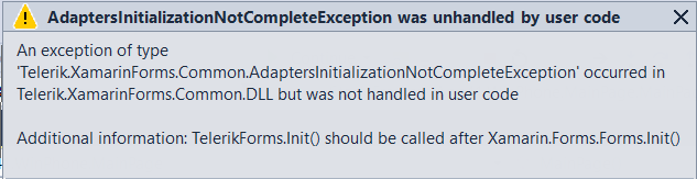 Thank you for sharing this additional information. While this issue gave us some idea what can causing it, we are unable to reproduce it from our side. Could you share the version of Visual Studio using as well as the version Xamarin forms and Our controls you are using. Also, do you run the application without modifications or replace references. Finally, on what device emulator are you running the project?