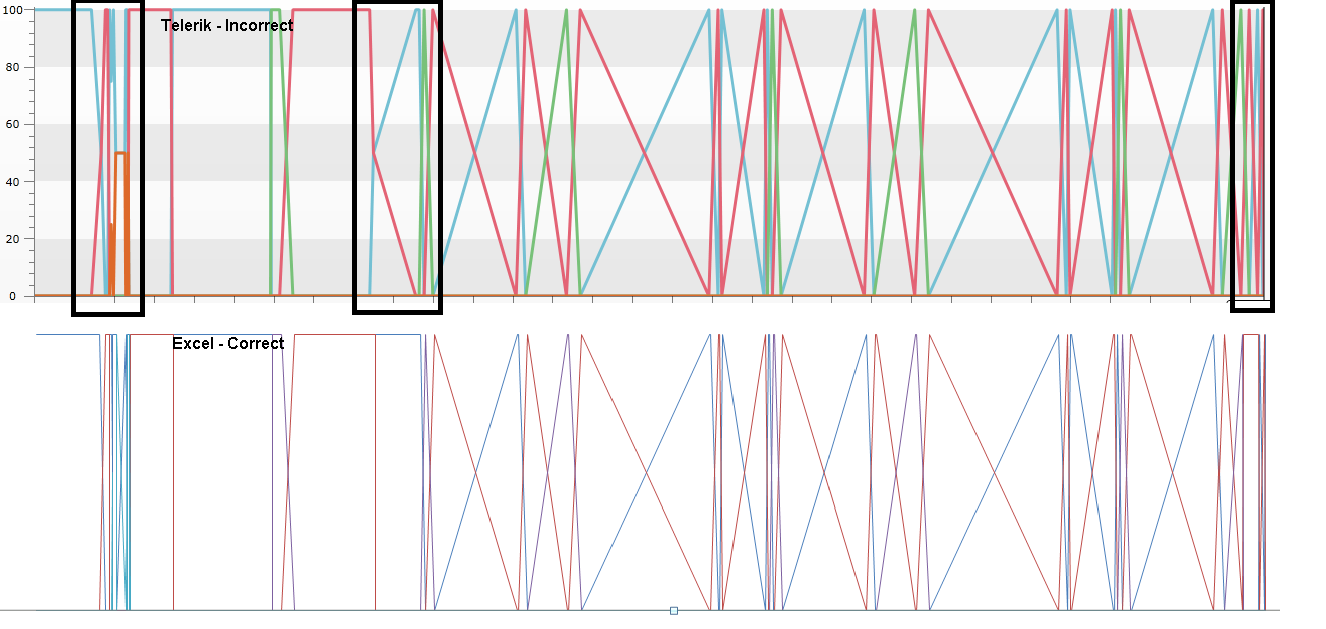 Attached image shows the difference between RadChart and Excel. Data is passed to RadChart as a List<List<DataPoint>>, where Datapoint has properties Value and Timestamp. series definitions are being created/added as follows: