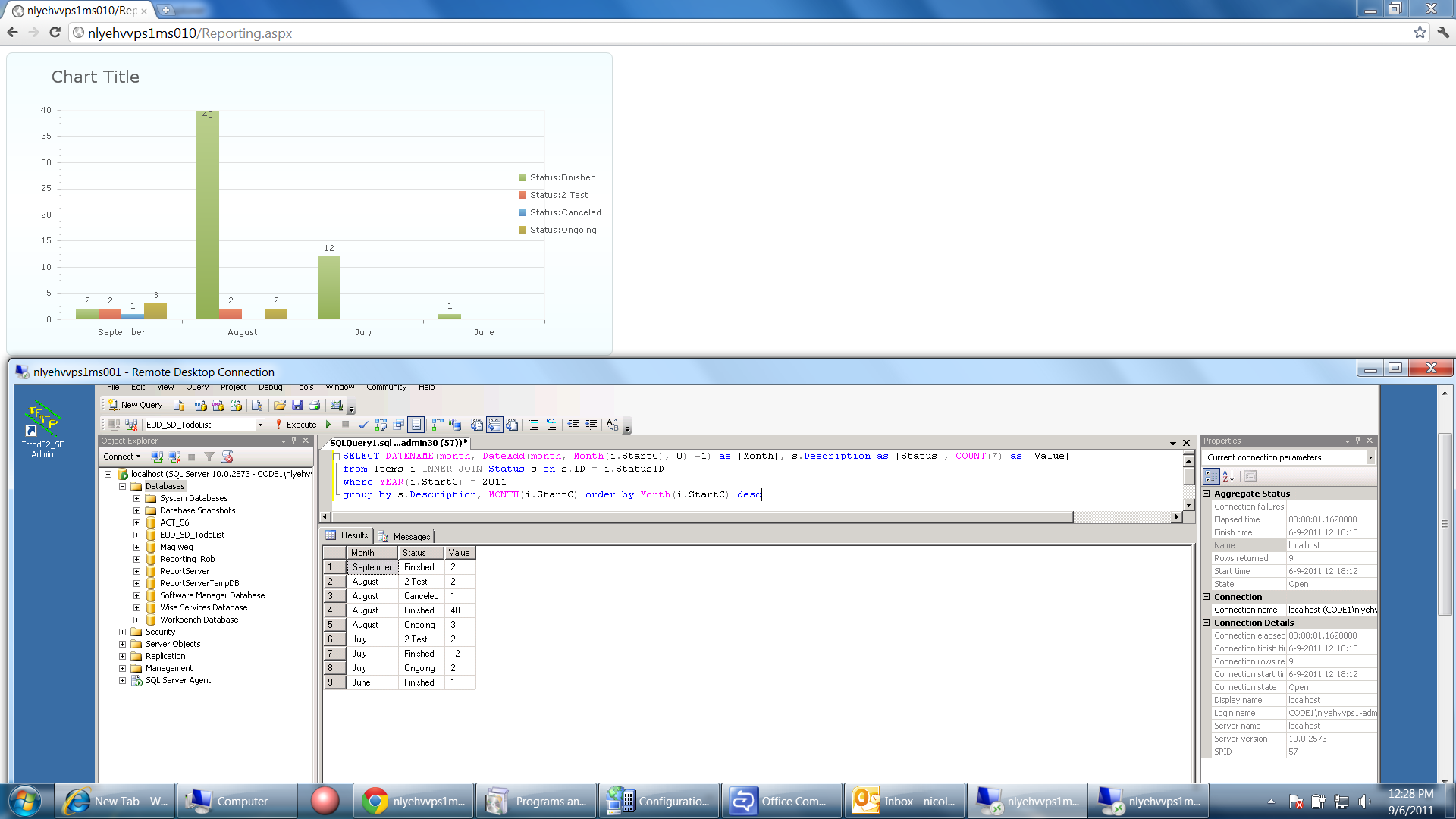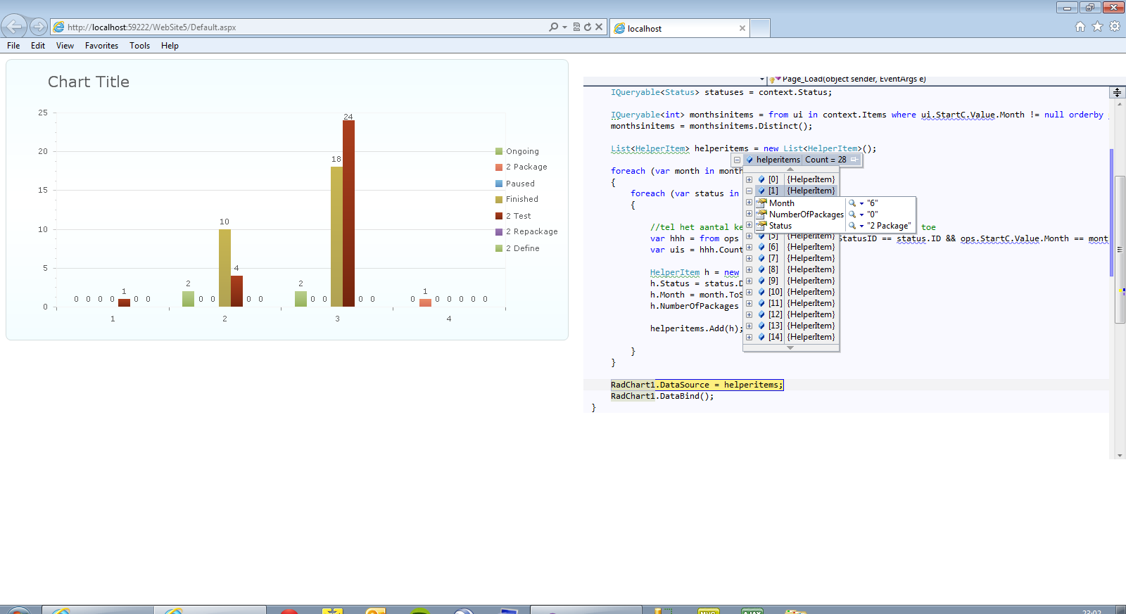 <div> <telerik:RadChart ID="RadChart1" runat="server" DataSourceID="SqlDataSource1" Height="400px" Skin="Vista" Width="800px"> </telerik:RadChart> <asp:SqlDataSource ID="SqlDataSource1" runat="server" ConnectionString="<%$ ConnectionStrings:EUD_SD_TodoListConnectionString %>" SelectCommand="select s.Description [Status], DateName( month , DateAdd( month , Month(i.StartC) , 0 ) - 1 ) as [Month], count(*) as [Value] from Items i INNER JOIN Status s ON s.ID = i.StatusID where Year(i.StartC) = 2011 group by s.Description, Month(i.StartC) order by Month(i.StartC) desc"> </asp:SqlDataSource> </div>Code Behind to group the chart: