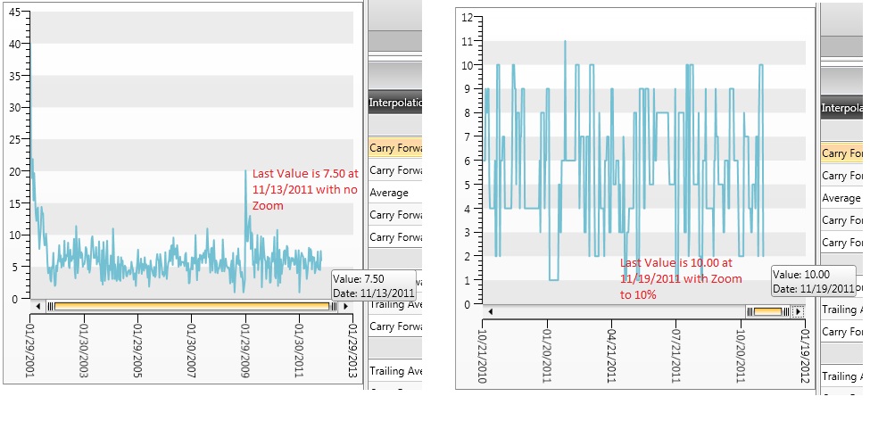 For this purpose, we enabled Zooming on the chart and found that in normal chart is not showing last 100 values, but when we enabled the sampling too at 400 then we found in normal we are missing last 6 values at the end of line.