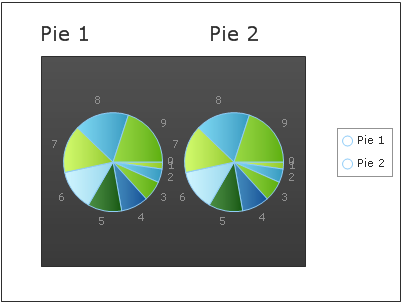 <telerik:RadChart ID="RadChart1" runat="server"> <Series> <telerik:ChartSeries Name="Pie 1" Type="Pie"> </telerik:ChartSeries> <telerik:ChartSeries Name="Pie 2" Type="Pie"> </telerik:ChartSeries> </Series> </telerik:RadChart>2. Use the Chart Title and set the text for the two Pies there (see the attached image showing the result):