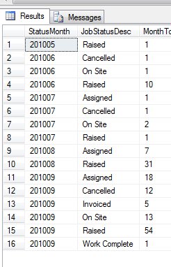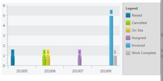 Fairly straightforward, but the chart (attached) skips a lot of the data! The data it does show is correct, but 201006 should also show a Raised value of 1, 201007 should show Raised, Cancelled and On Site values. One of the months (201008) isn't there at all, and 201009 is likewise missing values. No value above 5 is shown at all, but the chart seems to allocate space for the extra bars in the graph.