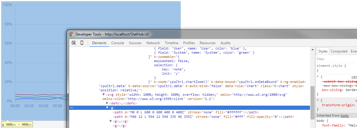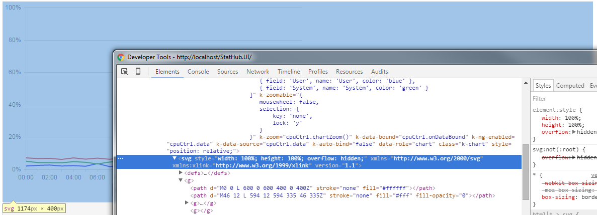 I am using Angularjs in combination with bootstrap. The chart displays after the data has been retrieved using the ng-show="hasData()" option. I want the chart to fill the width of the parent element.