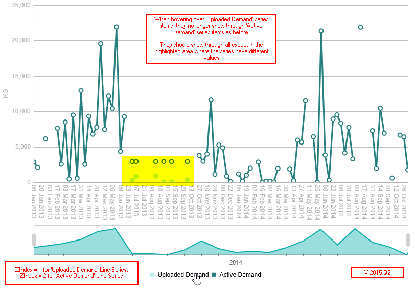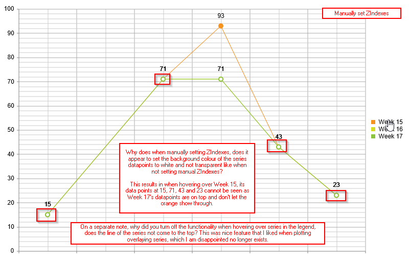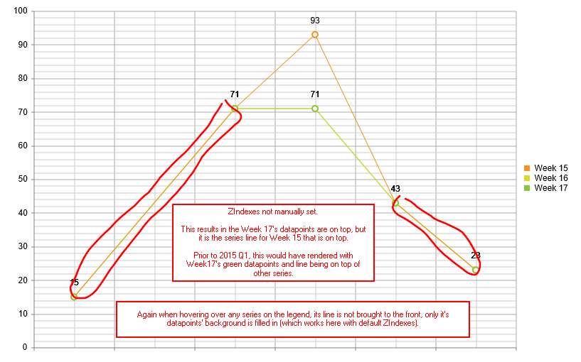 This was fine (not ideal but it worked) until 2015 Q2 arrived (and has not been corrected in 2015 Q2 SP1 either). Image "3_2015_Q2_Manual_ZIndexes" shows the issue when hovering on a series ​below another- the series datapoint below doesn't show through the series datapoint on top any longer. Leaving the ZIndexes to default fixes this, but makes the chart render like in image "1_2015_Q1_&_Q2_Default_ZIndexes". This is a minor issue.