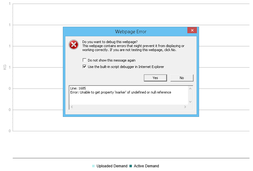 However, things get worse, for charts with missing values. This chart's series have MissingValues = HtmlChart.MissingValuesBehavior.Gap and manual ZIndexes set. If there are gaps in the plotted data, I receive a JavaScript error every time the chart is refreshed as shown in image "4_2015_Q2_ZIndexesSet_JS_Error". If I close the error popup and click a series in the legend, the chart renders until it is refreshed again. The JavaScript error does not appear if the plotted data is complete though.