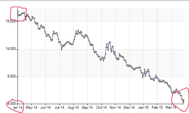 this.radChart.View.Margin = new Padding(15);ChartTooltipController toolTipController = new ChartTooltipController();toolTipController.DataPointTooltipTextNeeded += toolTipController_DataPointTooltipTextNeeded;this.radChart.Controllers.Add(toolTipController);this.radChart.ShowToolTip = true;this.radChart.ShowPanZoom = true;LineSeries dailySeries = new LineSeries();dailySeries.BorderColor = Color.DarkBlue;dailySeries.BorderWidth = 1;dailySeries.PointSize = new SizeF(5, 5);dailySeries.ShowLabels = true;foreach (var r in (from q in DailyData orderby q.FIXING_DATE select q)){ dailySeries.DataPoints.Add(new CategoricalDataPoint(r.FIXING, r.FIXING_DATE) { Label = "old" }); } DateTimeCategoricalAxis categoricalAxis = new DateTimeCategoricalAxis();categoricalAxis.DateTimeComponent = DateTimeComponent.Date;categoricalAxis.MajorTickInterval = 21;categoricalAxis.PlotMode = AxisPlotMode.OnTicks;categoricalAxis.LabelFitMode = AxisLabelFitMode.MultiLine;categoricalAxis.LabelFormat = "{0:MMM-yy}";CartesianArea area = this.radChart.GetArea<CartesianArea>();area.ShowGrid = true;CartesianGrid grid = area.GetGrid<CartesianGrid>();grid.DrawHorizontalFills = true;grid.BorderDashStyle = System.Drawing.Drawing2D.DashStyle.DashDot;//First assign the axis to the VerticalAxis property and then add the series to the chartdailySeries.HorizontalAxis = categoricalAxis; this.radChart.Series.Add(dailySeries);Can you pleaase suggest a solution to this problem?