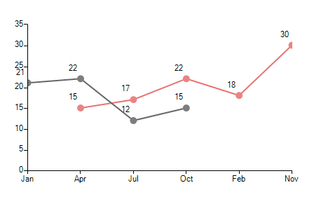 In order to achieve this, you can subscribe to the LabelFormatting event and in the handler manually move the label to the left. This can be done by setting a proper value to the PointLabelElement.PosittionOffset property. Please refer to the following example that uses LineSeries to plot the data points:
