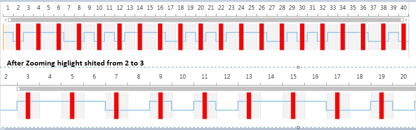 <Grid><br> <telerik:RadCartesianChart Height="1" Loaded="RadCartesianChart_Loaded" Palette="Arctic" ZoomChanged="RadCartesianChart_ZoomChanged"><br> <telerik:RadCartesianChart.HorizontalAxis><br> <telerik:CategoricalAxis VerticalLocation="Top" Visibility="Visible" LabelFitMode="None" LabelRotationAngle="-90" /><br> </telerik:RadCartesianChart.HorizontalAxis><br> <telerik:RadCartesianChart.VerticalAxis><br> <telerik:LinearAxis Minimum="-1" Maximum="2" MajorStep="1" MajorTickOffset="5" ElementBrush="Orange" /><br> </telerik:RadCartesianChart.VerticalAxis><br> <telerik:RadCartesianChart.Series><br> <telerik:StepLineSeries><br> <telerik:StepLineSeries.DataPoints><br> <telerik:CategoricalDataPoint Value="1"/><br> <telerik:CategoricalDataPoint Value="0" /><br> <telerik:CategoricalDataPoint Value="1" /><br> <telerik:CategoricalDataPoint Value="1" /><br> <telerik:CategoricalDataPoint Value="1"/><br> <telerik:CategoricalDataPoint Value="1" /><br> <telerik:CategoricalDataPoint Value="0" /><br> <telerik:CategoricalDataPoint Value="0"/><br> <telerik:CategoricalDataPoint Value="1"/><br> <telerik:CategoricalDataPoint Value="0" /><br> <telerik:CategoricalDataPoint Value="1"/><br> <telerik:CategoricalDataPoint Value="0" /><br> <telerik:CategoricalDataPoint Value="1" /><br> <telerik:CategoricalDataPoint Value="1" /><br> <telerik:CategoricalDataPoint Value="1"/><br> <telerik:CategoricalDataPoint Value="1" /><br> <telerik:CategoricalDataPoint Value="0" /><br> <telerik:CategoricalDataPoint Value="0"/><br> <telerik:CategoricalDataPoint Value="1"/><br> <telerik:CategoricalDataPoint Value="0" /><br> <telerik:CategoricalDataPoint Value="1"/><br> <telerik:CategoricalDataPoint Value="0" /><br> <telerik:CategoricalDataPoint Value="1" /><br> <telerik:CategoricalDataPoint Value="1" /><br> <telerik:CategoricalDataPoint Value="1"/><br> <telerik:CategoricalDataPoint Value="1" /><br> <telerik:CategoricalDataPoint Value="0" /><br> <telerik:CategoricalDataPoint Value="0"/><br> <telerik:CategoricalDataPoint Value="1"/><br> <telerik:CategoricalDataPoint Value="0" /><br> <telerik:CategoricalDataPoint Value="1"/><br> <telerik:CategoricalDataPoint Value="0" /><br> <telerik:CategoricalDataPoint Value="1" /><br> <telerik:CategoricalDataPoint Value="1" /><br> <telerik:CategoricalDataPoint Value="1"/><br> <telerik:CategoricalDataPoint Value="1" /><br> <telerik:CategoricalDataPoint Value="0" /><br> <telerik:CategoricalDataPoint Value="0"/><br> <telerik:CategoricalDataPoint Value="1"/><br> <telerik:CategoricalDataPoint Value="0" /><br><br> </telerik:StepLineSeries.DataPoints><br><br> <telerik:StepLineSeries.PointTemplate><br> <DataTemplate ><br> <StackPanel><br> <!--Fill="{Binding Presenter, Converter={StaticResource SeriesToPaletteColorConverter}}"--><br> <Rectangle Height="126" Width="10" Stroke="Transparent" Fill="Transparent" /><br> </StackPanel><br> <!--<DataTemplate.Triggers><br> <DataTrigger Value="1" Binding="{Binding Index}" ><br> <Setter Property="Opacity" Value="0.01" /><br> </DataTrigger><br> </DataTemplate.Triggers>--><br> </DataTemplate><br> </telerik:StepLineSeries.PointTemplate><br> </telerik:StepLineSeries><br> </telerik:RadCartesianChart.Series><br><br> <telerik:RadCartesianChart.Behaviors><br> <telerik:ChartPanAndZoomBehavior x:Name="panZoomBehavior" Changed="panZoomBehavior_Changed" ><br> </telerik:ChartPanAndZoomBehavior><br> </telerik:RadCartesianChart.Behaviors><br> <telerik:RadCartesianChart.Resources><br> <local:SeriesToPaletteColorConverter x:Key="SeriesToPaletteColorConverter" /><br> </telerik:RadCartesianChart.Resources><br> <telerik:RadCartesianChart.Grid><br> <telerik:CartesianChartGrid MajorLinesVisibility="XY" StripLinesVisibility="XY" IsTabStop="False" IsManipulationEnabled="False" ><br> <telerik:CartesianChartGrid.YStripeBrushes><br> <SolidColorBrush Color="#FFD7D7D7" Opacity="0.3" /><br> <SolidColorBrush Color="Transparent" /><br> </telerik:CartesianChartGrid.YStripeBrushes><br><br> <telerik:CartesianChartGrid.XStripeBrushes><br> <SolidColorBrush Color="#FFD7D7D7" Opacity="0.3" /><br> <SolidColorBrush Color="Transparent" /><br> </telerik:CartesianChartGrid.XStripeBrushes><br><br> </telerik:CartesianChartGrid><br> </telerik:RadCartesianChart.Grid><br> <telerik:RadCartesianChart.SelectionPalette><br> <telerik:ChartPalette><br> <telerik:ChartPalette.GlobalEntries><br> <telerik:PaletteEntry Fill="Red" /><br> </telerik:ChartPalette.GlobalEntries><br> </telerik:ChartPalette><br> </telerik:RadCartesianChart.SelectionPalette><br> </telerik:RadCartesianChart><br> </Grid>