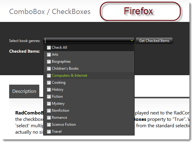 As was noted in the 2012 Q3 release notes, RadComboBox is no longer decorated by RadFormDecorator. I understand that there may be very good reasons for this change, but it now leaves us with the ugly default IE check boxes instead of the nice looking check boxes rendered by RadFormDecorator. Is there a simple way to recover the check box appearance within RadComboBox that was available in 2012 Q2 and prior?