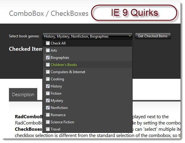 Please note that the check boxes appear properly in 2012 Q3 when using Firefox or when using IE in Quirks mode. They are displaying strangely when using IE 9 in IE 9/8/7 browser mode or document mode. Please see the attached screen shots of the Telerik RadComboBox with check boxes demo page (http://demos.telerik.com/aspnet-ajax/combobox/examples/functionality/checkboxes/defaultcs.aspx).
