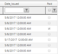 <%@ Page Language="C#" AutoEventWireup="true" CodeFile="Default.aspx.cs" Inherits="_Default" %><%@ Register Assembly="Telerik.Web.UI" Namespace="Telerik.Web.UI" TagPrefix="telerik" %><!DOCTYPE html><html xmlns="http://www.w3.org/1999/xhtml"><head runat="server"> <title></title></head><body> <form id="form1" runat="server"> <div> <telerik:RadScriptManager ID="RadScriptManager1" runat="server"></telerik:RadScriptManager> <telerik:RadGrid ID="CGRUnPaidFees2017" runat="server" AllowAutomaticInserts="True" CGRUnPaidFees2017_Init="true" OnItemDeleted="CGRUnPaidFees2017_ItemDeleted" OnItemInserted="CGRUnPaidFees2017_ItemInserted" OnItemUpdated="CGRUnPaidFees2017_ItemUpdated" OnPreRender="CGRUnPaidFees2017_PreRender" AllowAutomaticUpdates="True" AllowPaging="True" AutoGenerateColumns="True" DataSourceID="UnPaidFees2017" Height="945px" Width="1380px"><GroupingSettings CollapseAllTooltip="Collapse all groups" CaseSensitive="False"></GroupingSettings> <SortingSettings EnableSkinSortStyles="False" /><ExportSettings ExportOnlyData="True"></ExportSettings> <ClientSettings> <Scrolling AllowScroll="True" UseStaticHeaders="True" /> </ClientSettings> <MasterTableView AutoGenerateColumns="False" DataKeyNames="Paid" DataSourceID="UnPaidFees2017" PageSize="34" AllowFilteringByColumn="True" ShowGroupFooter="True" GridLines="Both"> <Columns> <telerik:GridBoundColumn DataField="School" HeaderButtonType="PushButton" FilterControlAltText="Filter School column" HeaderText="School" SortExpression="School" UniqueName="School"> </telerik:GridBoundColumn> <telerik:GridBoundColumn DataField="Student_Matric" HeaderButtonType="PushButton" FilterControlAltText="Filter Student_Matric column" HeaderText="Student_Matric" SortExpression="Student_Matric" UniqueName="Student_Matric" DataType="System.Double"> </telerik:GridBoundColumn> <telerik:GridBoundColumn DataField="Name" HeaderButtonType="PushButton" FilterControlAltText="Filter Name column" HeaderText="Name" SortExpression="Name" UniqueName="Name"> </telerik:GridBoundColumn> <telerik:GridBoundColumn DataField="Fee_Amount" HeaderButtonType="PushButton" FilterControlAltText="Filter Fee_Amount column" HeaderText="Fee_Amount" SortExpression="Fee_Amount" UniqueName="Fee_Amount" DataType="System.Double"> </telerik:GridBoundColumn> <telerik:GridBoundColumn DataField="Fee" FilterControlAltText="Filter Fee column" HeaderButtonType="PushButton" HeaderText="Fee" SortExpression="Fee" UniqueName="Fee"> </telerik:GridBoundColumn> <telerik:GridBoundColumn DataField="Date_Issued" DataType="System.DateTime" HeaderButtonType="PushButton" FilterControlAltText="Filter Date_Issued column" HeaderText="Date_Issued" SortExpression="Date_Issued" UniqueName="Date_Issued"> </telerik:GridBoundColumn> <telerik:GridCheckboxColumn DataField="Paid" FilterControlAltText="Filter Paid column" HeaderText="Paid" HeaderButtonType="PushButton" SortExpression="Paid" UniqueName="Paid" AutoPostBackOnFilter="True"> </telerik:GridCheckboxColumn> </Columns> <EditFormSettings> </EditFormSettings> </MasterTableView> <FilterItemStyle HorizontalAlign="Left" VerticalAlign="Middle" /> <PagerStyle PageSizes="30;60;90;120" PageButtonCount="30" /></telerik:RadGrid> <asp:SqlDataSource ID="UnPaidFees2017" runat="server" ConnectionString="<%$ ConnectionStrings:pedrolConnectionString %>" SelectCommand="SELECT School, [Student Matric] AS Student_Matric, Name, [Fee Amount] AS Fee_Amount, Fee, [Date Issued] AS Date_Issued, Paid FROM UnPaidFees2017" UpdateCommand="UPDATE UnPaidFees2017 SET Paid = @Paid" OnSelecting="UnPaidFees2017_Selecting" InsertCommand="INSERT INTO UnPaidFees2017(Paid) VALUES (@Paid)"> <InsertParameters> <asp:Parameter Name="Paid" Type="Boolean" /> </InsertParameters> <UpdateParameters> <asp:Parameter Name="Paid" Type="Boolean" /> </UpdateParameters> </asp:SqlDataSource> </div> </form></body></html>