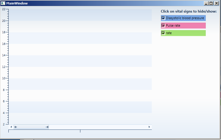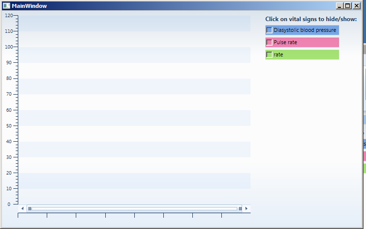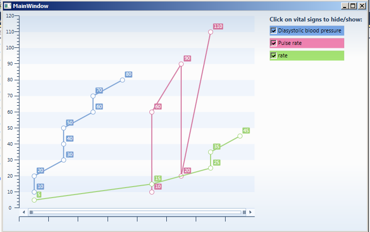 public partial class MainWindow : Window { public MainWindow() { InitializeComponent(); userControl11.initViewModel(); userControl11.addData(DateTime.Now.ToString("g"), "10", "Diasystolic blood pressure", DateTime.Now.ToString("g")); userControl11.addData(DateTime.Now.AddDays(2).ToString("g"), "20", "Diasystolic blood pressure", DateTime.Now.ToString("g")); userControl11.addData(DateTime.Now.AddDays(4).ToString("g"), "30", "Diasystolic blood pressure", DateTime.Now.AddDays(2).ToString("g")); userControl11.addData(DateTime.Now.AddDays(6).ToString(), "40", "Diasystolic blood pressure", DateTime.Now.AddDays(2).ToString("g")); userControl11.addData(DateTime.Now.AddDays(8).ToString(), "50", "Diasystolic blood pressure", DateTime.Now.AddDays(2).ToString("g")); userControl11.addData(DateTime.Now.AddDays(10).ToString(), "60", "Diasystolic blood pressure", DateTime.Now.AddDays(4).ToString("g")); userControl11.addData(DateTime.Now.AddDays(11).ToString(), "70", "Diasystolic blood pressure", DateTime.Now.AddDays(4).ToString("g")); userControl11.addData(DateTime.Now.AddDays(12).ToString(), "80", "Diasystolic blood pressure", DateTime.Now.AddDays(6).ToString("g")); userControl11.addData(DateTime.Now.AddDays(1).ToString(), "10", "Pulse rate", DateTime.Now.AddDays(1).ToString("g")); userControl11.addData(DateTime.Now.AddDays(3).ToString(), "60", "Pulse rate", DateTime.Now.AddDays(1).ToString("g")); userControl11.addData(DateTime.Now.AddDays(5).ToString(), "90", "Pulse rate", DateTime.Now.AddDays(3).ToString("g")); userControl11.addData(DateTime.Now.AddDays(7).ToString(), "20", "Pulse rate", DateTime.Now.AddDays(3).ToString("g")); userControl11.addData(DateTime.Now.AddDays(9).ToString(), "110", "Pulse rate", DateTime.Now.AddDays(5).ToString("g")); userControl11.addData(DateTime.Now.AddDays(1).ToString(), "5", "rate", DateTime.Now.ToString("g")); userControl11.addData(DateTime.Now.AddDays(3).ToString(), "15", "rate", DateTime.Now.AddDays(1).ToString("g")); userControl11.addData(DateTime.Now.AddDays(5).ToString(), "25", "rate", DateTime.Now.AddDays(5).ToString("g")); userControl11.addData(DateTime.Now.AddDays(7).ToString(), "35", "rate", DateTime.Now.AddDays(5).ToString("g")); userControl11.addData(DateTime.Now.AddDays(9).ToString(), "45", "rate", DateTime.Now.AddDays(7).ToString("g")); userControl11.setSeriesMapping(); } private void Window_Loaded(object sender, RoutedEventArgs e) { userControl11.getchkbxControl(); }