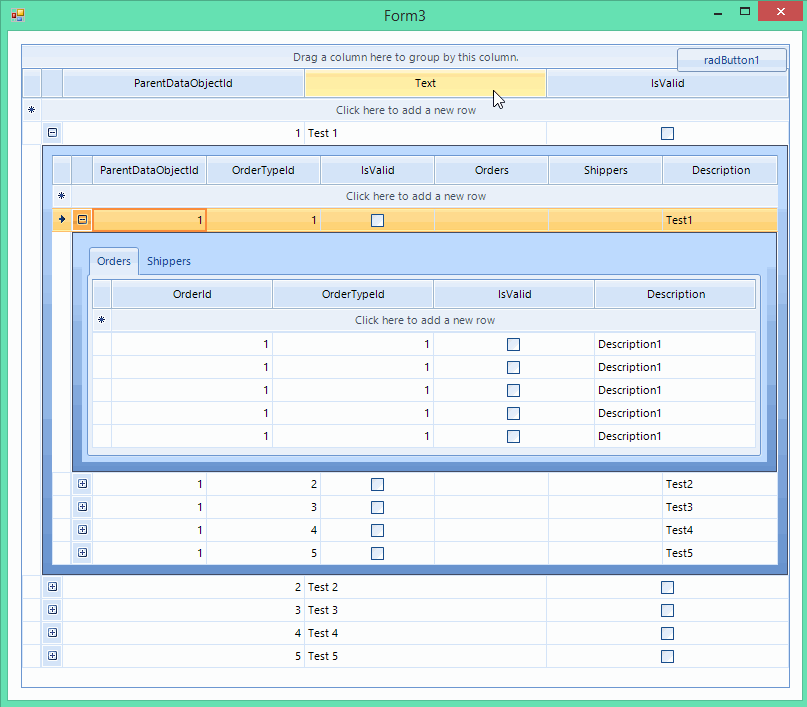 public RadForm1(){ InitializeComponent(); DataTable dt = new DataTable(); dt.Columns.Add("IsActive", typeof(bool)); dt.Columns.Add("Name", typeof(string)); for (int i = 0; i < 5; i++) { dt.Rows.Add(false, "Item" + i); } this.radGridView1.CreateCell += radGridView1_CreateCell; this.radGridView1.DataSource = dt; this.radGridView1.AutoSizeColumnsMode = Telerik.WinControls.UI.GridViewAutoSizeColumnsMode.Fill;}private void radGridView1_CreateCell(object sender, GridViewCreateCellEventArgs e){ if (e.CellType == typeof(GridCheckBoxHeaderCellElement)) { e.CellElement = new CustomGridCheckBoxHeaderCellElement(e.Column, e.Row); }}public class CustomGridCheckBoxHeaderCellElement : GridCheckBoxHeaderCellElement{ public CustomGridCheckBoxHeaderCellElement(GridViewColumn column, GridRowElement row) : base(column, row) { } RadCheckBoxElement myCheckBoxElement = new RadCheckBoxElement(); protected override void CreateChildElements() { base.CreateChildElements(); myCheckBoxElement.ToggleStateChanged += myCheckBoxElement_ToggleStateChanged; this.Children.Add(myCheckBoxElement); } private void myCheckBoxElement_ToggleStateChanged(object sender, StateChangedEventArgs args) { this.GridControl.BeginUpdate(); this.RowInfo.Tag = args.ToggleState; foreach (GridViewRowInfo row in this.GridControl.Rows) { if (row.HierarchyLevel == 0) { row.Cells["IsActive"].Value = args.ToggleState; } } this.GridControl.EndUpdate(); } public override void SetContent() { base.SetContent(); myCheckBoxElement.ToggleStateChanged -= myCheckBoxElement_ToggleStateChanged; if (this.RowInfo.Tag != null) { myCheckBoxElement.ToggleState = (ToggleState)this.RowInfo.Tag; } myCheckBoxElement.ToggleStateChanged += myCheckBoxElement_ToggleStateChanged; }}Note that this is just a sample approach and it may not cover all possible cases. Feel free to modify it in a way which suits your requirement best.