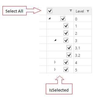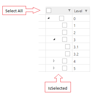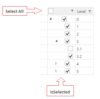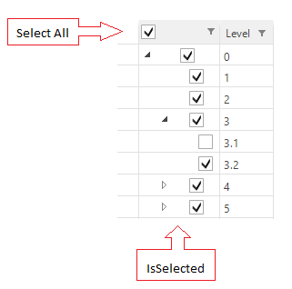 All the checkboxes in "IsSelected" column, include the Select All , have the same GridViewCheckBoxColumn type and all of the rows, include the header row, have the same GridViewHierarchyRowInfo type. That's why when I click on the checkbox of level 3.1, I have no idea to detect the Select All checkbox to update its state. And I recognized the Select All checkbox and the checkbox of level 0 has the relationship, they always have the same state, I afraid if the Select All checkbox is unchecked, the checkbox of level 0 is unchecked too.