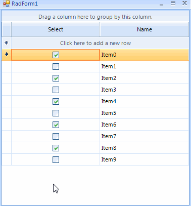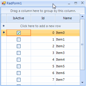 public RadForm1(){ InitializeComponent(); this.radGridView1.CurrentRowChanging += radGridView1_CurrentRowChanging; DataTable dt = new DataTable(); dt.Columns.Add("IsActive", typeof(bool)); dt.Columns.Add("Id", typeof(int)); dt.Columns.Add("Name", typeof(string)); for (int i = 0; i < 10; i++) { dt.Rows.Add(false, i, "Item" + i); } this.radGridView1.DataSource = dt; this.radGridView1.AutoSizeColumnsMode = Telerik.WinControls.UI.GridViewAutoSizeColumnsMode.Fill; }private void radGridView1_CurrentRowChanging(object sender, Telerik.WinControls.UI.CurrentRowChangingEventArgs e){ if (e.NewRow != null) { e.NewRow.Cells["IsActive"].Value = true; } if (e.CurrentRow != null) { e.CurrentRow.Cells["IsActive"].Value = false; }}I hope this information helps. Should you have further questions I would be glad to help.