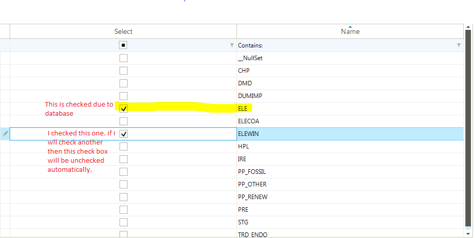 I created the grid with a list as the data source. My data has two columns (bool, string) and a few rows. I need to select multiple rows but unable to do so. If I select one check then the previously selected row gets unchecked. The checked row which was created because of the bool=true column remains unchanged.