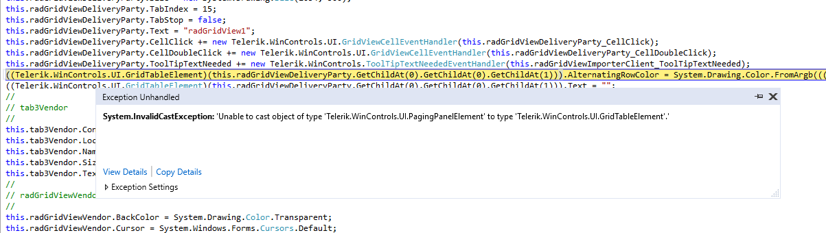 System.InvalidCastException: 'Unable to cast object of type 'Telerik.WinControls.UI.PagingPanelElement' to type 'Telerik.WinControls.UI.GridTableElement'.'