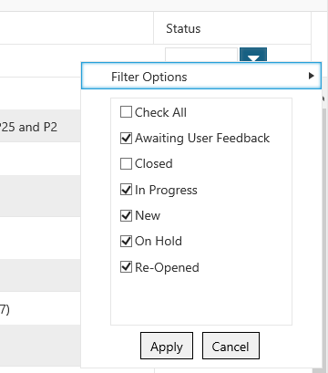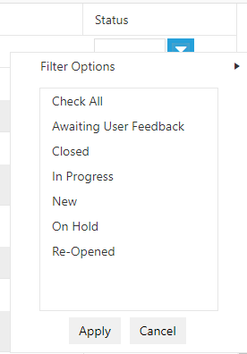 protected void RadGrid1_FilterCheckListItemsRequested(object sender, GridFilterCheckListItemsRequestedEventArgs e) { string DataField = (e.Column as IGridDataColumn).GetActiveDataField(); e.ListBox.DataSource = GetDateTable(DataField); e.ListBox.DataKeyField = DataField; e.ListBox.DataTextField = DataField; e.ListBox.DataValueField = DataField; e.ListBox.DataBind(); } public DataTable GetDateTable(string field) { string query = string.Format("SELECT DISTINCT {0} FROM Statuses WHERE Active = 1", field); // String ConnString = ConfigurationManager.ConnectionStrings["NorthwindConnectionString"].ConnectionString; SqlConnection conn = new SqlConnection(connectionStringDatabase); SqlDataAdapter adapter = new SqlDataAdapter(); adapter.SelectCommand = new SqlCommand(query, conn); DataTable myDataTable = new DataTable(); conn.Open(); try { adapter.Fill(myDataTable); } finally { conn.Close(); } return myDataTable; }<telerik:RadAjaxPanel ID="RadAjaxPanel1" LoadingPanelID="LoadingPanel1" runat="server" CssClass="grid_wrapper"> <telerik:RadGrid ID="RadGrid1" runat="server" AllowPaging="True" PageSize="20" ShowFooter="True" RenderMode="Lightweight" DataSourceID="SqlDataSource1" AllowFilteringByColumn="True" Skin="Metro" AllowSorting="True" AutoGenerateColumns="False" AllowAutomaticUpdates="false" AllowAutomaticInserts="false" OnUpdateCommand="RadGrid1_UpdateCommand" ShowStatusBar="True" FilterType="Combined" OnFilterCheckListItemsRequested="RadGrid1_FilterCheckListItemsRequested"> <GroupingSettings CollapseAllTooltip="Collapse all groups" /> <ExportSettings ExportOnlyData="true" IgnorePaging="true"></ExportSettings> <AlternatingItemStyle BorderColor="#99CCFF" /> <MasterTableView TableLayout="Fixed" DataKeyNames="ID" CommandItemDisplay="Top" AllowMultiColumnSorting="true" AllowNaturalSort="false"> <CommandItemSettings ShowAddNewRecordButton="false" ShowExportToExcelButton="true" ShowExportToWordButton="true" /> <Columns> <telerik:GridHyperLinkColumn HeaderText="Ticket ID" DataNavigateUrlFields="ID" DataNavigateUrlFormatString="~/editTicket.aspx?t={0}" DataTextField="ID" UniqueName="ID" SortExpression="ID" FilterControlAltText="Filter ID column" FilterControlWidth="70px"> <HeaderStyle Width="70px" /> </telerik:GridHyperLinkColumn> <telerik:GridDateTimeColumn DataField="dtReported" HeaderText="Date Reported" FilterControlWidth="100px" SortExpression="dtReported" EnableTimeIndependentFiltering="true" UniqueName="dtReported" PickerType="DatePicker" DataFormatString="{0:dd/MM/yyyy HH:mm:ss}"> <HeaderStyle Width="100px" /> </telerik:GridDateTimeColumn> <telerik:GridBoundColumn DataField="ReportedBy" HeaderText="Reported By" SortExpression="ReportedBy" FilterControlWidth="80px" UniqueName="ReportedBy"> <HeaderStyle Width="80px" /> </telerik:GridBoundColumn> <telerik:GridBoundColumn DataField="AssignedUser" FilterControlAltText="Filter AssignedUser column" FilterControlWidth="100px" HeaderText="Assigned To" SortExpression="AssignedUser" UniqueName="AssignedUser"> <FilterTemplate> <telerik:RadComboBox ID="RCB_AssignedUser" DataSourceID="SqlDataSource2" DataTextField="AssignedUser" DataValueField="AssignedUser" AppendDataBoundItems="true" SelectedValue='<%# ((GridItem)Container).OwnerTableView.GetColumn("AssignedUser").CurrentFilterValue %>' runat="server" OnClientSelectedIndexChanged="ResourceIndexChanged"> <Items> <telerik:RadComboBoxItem Text="All" /> </Items> </telerik:RadComboBox> <telerik:RadScriptBlock ID="RadScriptBlock1" runat="server"> <script type="text/javascript"> function ResourceIndexChanged(sender, args) { var tableView = $find("<%# ((GridItem)Container).OwnerTableView.ClientID %>"); tableView.filter("AssignedUser", args.get_item().get_value(), "EqualTo"); } </script> </telerik:RadScriptBlock> </FilterTemplate> <HeaderStyle Width="100px" /> </telerik:GridBoundColumn> <telerik:GridBoundColumn DataField="Category" FilterControlAltText="Filter Category column" FilterControlWidth="100px" HeaderText="Category" SortExpression="Category" UniqueName="Category"> <FilterTemplate> <telerik:RadComboBox ID="RCB_Category" runat="server" DataSourceID="SqlDataSource3" DataTextField="Category" DataValueField="Category" AppendDataBoundItems="true" SelectedValue='<%# ((GridItem)Container).OwnerTableView.GetColumn("Category").CurrentFilterValue %>' OnClientSelectedIndexChanged="CategoryIndexChanged"> <Items> <telerik:RadComboBoxItem Text="All" /> </Items> </telerik:RadComboBox> <telerik:RadScriptBlock ID="RadScriptBlock2" runat="server"> <script type="text/javascript"> function CategoryIndexChanged(sender, args) { var tableView = $find("<%# ((GridItem)Container).OwnerTableView.ClientID %>"); tableView.filter("Category", args.get_item().get_value(), "EqualTo"); } </script> </telerik:RadScriptBlock> </FilterTemplate> <HeaderStyle Width="100px" /> </telerik:GridBoundColumn> <telerik:GridBoundColumn DataField="Priority" FilterControlAltText="Filter Priority column" FilterControlWidth="100px" HeaderText="Priority" SortExpression="Priority" UniqueName="Priority"> <FilterTemplate> <telerik:RadComboBox ID="RCB_Priority" runat="server" DataSourceID="SqlDataSource4" DataTextField="Priority" DataValueField="Priority" AppendDataBoundItems="true" SelectedValue='<%# ((GridItem)Container).OwnerTableView.GetColumn("Priority").CurrentFilterValue %>' OnClientSelectedIndexChanged="PriorityIndexChanged"> <Items> <telerik:RadComboBoxItem Text="All" /> </Items> </telerik:RadComboBox> <telerik:RadScriptBlock ID="RadScriptBlock3" runat="server"> <script type="text/javascript"> function PriorityIndexChanged(sender, args) { var tableView = $find("<%# ((GridItem)Container).OwnerTableView.ClientID %>"); tableView.filter("Priority", args.get_item().get_value(), "EqualTo"); } </script> </telerik:RadScriptBlock> </FilterTemplate> <HeaderStyle Width="100px" /> </telerik:GridBoundColumn> <telerik:GridBoundColumn DataField="Subject" HeaderText="Subject" SortExpression="Subject" FilterControlWidth="200px" UniqueName="Subject"> <HeaderStyle Width="250