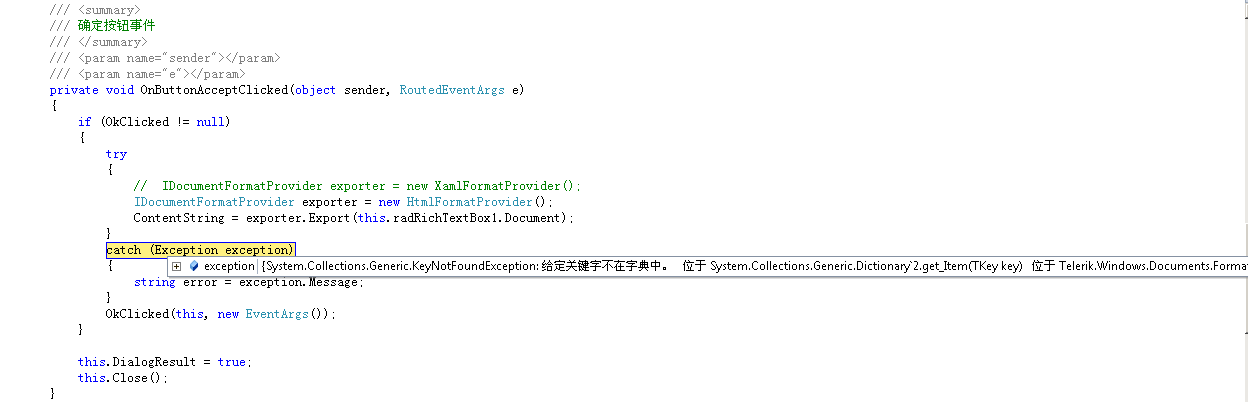 {System.Collections.Generic.KeyNotFoundException: 给定关键字不在字典中。 位于 System.Collections.Generic.Dictionary`2.get_Item(TKey key) 位于 Telerik.Windows.Documents.FormatProviders.Html.Export.HtmlDocumentExporter.GetClassesForStyle(StyleDefinition style, StringBuilder sb) 位于 Telerik.Windows.Documents.FormatProviders.Html.Export.HtmlDocumentExporter.GetClassesForElement(DocumentElement de) 位于 Telerik.Windows.Documents.FormatProviders.Html.Export.HtmlDocumentExporter.AddStyleForSpan(Span span) 位于 Telerik.Windows.Documents.FormatProviders.Html.Export.HtmlDocumentExporter.ExportSpan(Paragraph paragraph, Span span) 位于 Telerik.Windows.Documents.FormatProviders.Html.Export.HtmlDocumentExporter.ExportInline(Paragraph paragraph, Inline inline) 位于 Telerik.Windows.Documents.FormatProviders.Html.Export.HtmlDocumentExporter.ExportParagraphContents(Paragraph paragraph) 位于 Telerik.Windows.Documents.FormatProviders.Html.Export.HtmlDocumentExporter.ExportBlockContainer(IBlockContainer blockContainer) 位于 Telerik.Windows.Documents.FormatProviders.Html.Export.HtmlDocumentExporter.ExportBodyContent() 位于 Telerik.Windows.Documents.FormatProviders.Html.Export.HtmlDocumentExporter.ExportBody() 位于 Telerik.Windows.Documents.FormatProviders.Html.Export.HtmlDocumentExporter.ExportDocumentInternal(RadDocument document, Stream output) 位于 Telerik.Windows.Documents.FormatProviders.Html.Export.HtmlDocumentExporter.Export(RadDocument document, Stream output) 位于 Telerik.Windows.Documents.FormatProviders.Html.HtmlFormatProvider.Export(RadDocument document, Stream output) 位于 Telerik.Windows.Documents.FormatProviders.DocumentFormatProviderBase.Export(RadDocument document) 位于 PMMSilverlight.Common.RichTextBoxChildWinStream.OnButtonAcceptClicked(Object sender, RoutedEventArgs e)}I have two page: Add & RichTextBoxChildWinStream