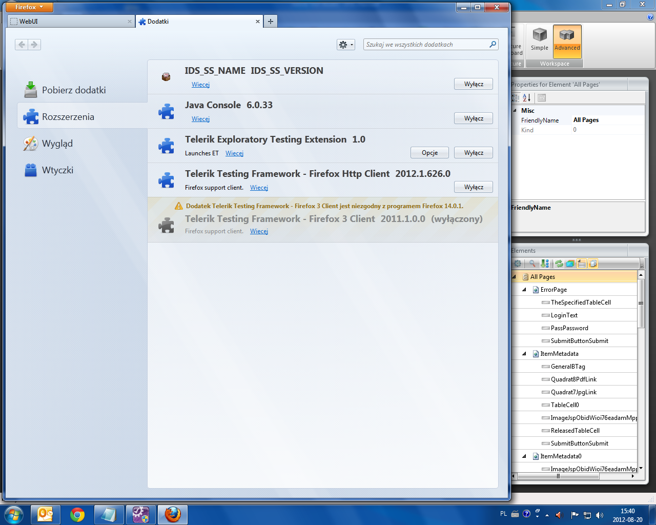 Thank you for answer.Chrome now is correct. I do exactly like this http://www.telerik.com/automated-testing-tools/support/documentation/user-guide/troubleshooting_guide/test-execution-problems/firefox/firefox-extension-not-installed.aspx but Firefox still not work correctly. I have Test Studio version 2012.1.719.0, and Firefox 14.01. I attach my print screen with Firefox settings.