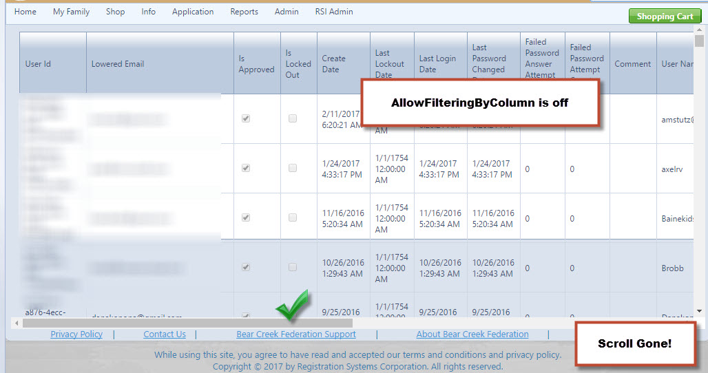 <telerik:RadGrid ID="radGrid" runat="server" AutoGenerateColumns="False" OnNeedDataSource="radGrid_NeedDataSource" AllowFilteringByColumn="True" AllowPaging="True" AllowSorting="True" ShowFooter="True" ShowGroupPanel="True" ShowStatusBar="True" CellSpacing="0" OnColumnCreating="radGrid_ColumnCreating" OnItemCommand="radGrid_ItemCommand" EnableLinqExpressions="false" Width="900px" > <ExportSettings IgnorePaging="True" ExportOnlyData="true" OpenInNewWindow="true" FileName="Event List" HideStructureColumns="true"> </ExportSettings> <ClientSettings AllowColumnsReorder="True" AllowDragToGroup="True" AllowKeyboardNavigation="True"> <Scrolling AllowScroll="false" EnableVirtualScrollPaging="True" /> <Animation AllowColumnReorderAnimation="True" AllowColumnRevertAnimation="True" /> <ClientEvents OnRowDblClick="RowDblClick" /> </ClientSettings> <MasterTableView NoDetailRecordsText="No Events Currently Listed" NoMasterRecordsText="No Events Currently Listed" CommandItemDisplay="None" AllowMultiColumnSorting="True" EditMode="PopUp"> <CommandItemSettings ExportToPdfText="Export to PDF" ShowAddNewRecordButton="False" ShowExportToExcelButton="True" ShowExportToCsvButton="True" ShowExportToPdfButton="True" ShowExportToWordButton="True" /> <RowIndicatorColumn FilterControlAltText="Filter RowIndicator column" Visible="True"> </RowIndicatorColumn> <ExpandCollapseColumn FilterControlAltText="Filter ExpandColumn column" Visible="True"> </ExpandCollapseColumn> <Columns> </Columns> <EditFormSettings EditFormType="WebUserControl" UserControlName="~/Controls/EventEmailer.ascx" PopUpSettings-Modal="true" PopUpSettings-Height="500" PopUpSettings-Width="900" CaptionDataField="TitleOfEvent"> <EditColumn FilterControlAltText="Filter EditCommandColumn column" UniqueName="EditCommandColumn1"> </EditColumn> </EditFormSettings> </MasterTableView> <FilterMenu EnableImageSprites="False" EnableRoundedCorners="True"> </FilterMenu> </telerik:RadGrid>The columns are added at run time as I am using the google like filtering feature as demo'd on the site.