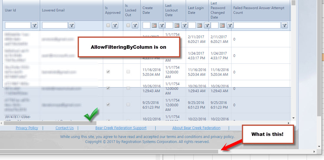 if (!IsPostBack) { //clear items. radGrid.MasterTableView.Columns.Clear(); //add events EventList = LoadEvents(CurrentStyle); CustomFilteringDropDown title = new CustomFilteringDropDown(); radGrid.MasterTableView.Columns.Add(title); AddGridColumns(ref title, "HtmlEncodeTitle", "Title", string.Empty, "portaltablelink", true, "TitleOfEvent", 400); CustomFilteringDropDown startDate = new CustomFilteringDropDown(); radGrid.MasterTableView.Columns.Add(startDate); AddGridColumns(ref startDate, "startDate", "Start", "ddd, dd MMM yy", string.Empty, false, "startDate", 100); CustomFilteringDropDown endDate = new CustomFilteringDropDown(); radGrid.MasterTableView.Columns.Add(endDate); AddGridColumns(ref endDate, "endDate", "End", "ddd, dd MMM yy", string.Empty, false, "endDate", 100); CustomFilteringDropDown town = new CustomFilteringDropDown(); radGrid.MasterTableView.Columns.Add(town); AddGridColumns(ref town, "Town", "Town", string.Empty, string.Empty, true, "Town", 150); CustomFilteringDropDown country = new CustomFilteringDropDown(); radGrid.MasterTableView.Columns.Add(country); AddGridColumns(ref country, "Country", "Country", string.Empty, string.Empty, true, "Country", 150); GridEditCommandColumn editColumn = new GridEditCommandColumn(); radGrid.MasterTableView.Columns.Add(editColumn); editColumn.UniqueName = "EditCommandColumn"; editColumn.ButtonType = GridButtonColumnType.ImageButton; editColumn.EditImageUrl = "~/Styles/ClientDefault/Images/ContactUs/email_dialog_icon.png"; editColumn.EditText = "Email Delegates this link"; }private void AddGridColumns(ref CustomFilteringDropDown item, string dataField, string headerText, string dataFormat, string cssClass, bool enableFilter, string groupByClause, int width) { item.DataField = dataField; item.UniqueName = dataField; item.HtmlEncode = false; item.Groupable = true; item.GroupByExpression = string.Format("{0} Group By {1}", groupByClause, groupByClause); item.AllowSorting = true; item.AllowFiltering = enableFilter; item.SortExpression = dataField; item.HeaderText = headerText; item.DataFormatString = "{0:" + dataFormat + "}"; item.ItemStyle.CssClass = cssClass; item.HeaderStyle.Width = Unit.Pixel(width); item.FilterControlWidth = Unit.Pixel(width); }If anyone can shed any light on why this is happening it would be great.