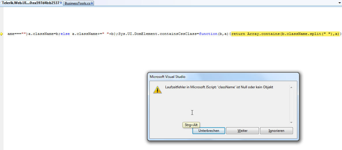 Since version Q3 a probleme occur if the cursor moves over the tapsrtip in the radwindow. This happens only on client side without any postback to codebehind. There are no defined action on the tabs. Only the thinks are defined trough the CSS-Class or Skin. Here I use Office2007 Skin. See also the atchemnt. The error is "className is null or no object".