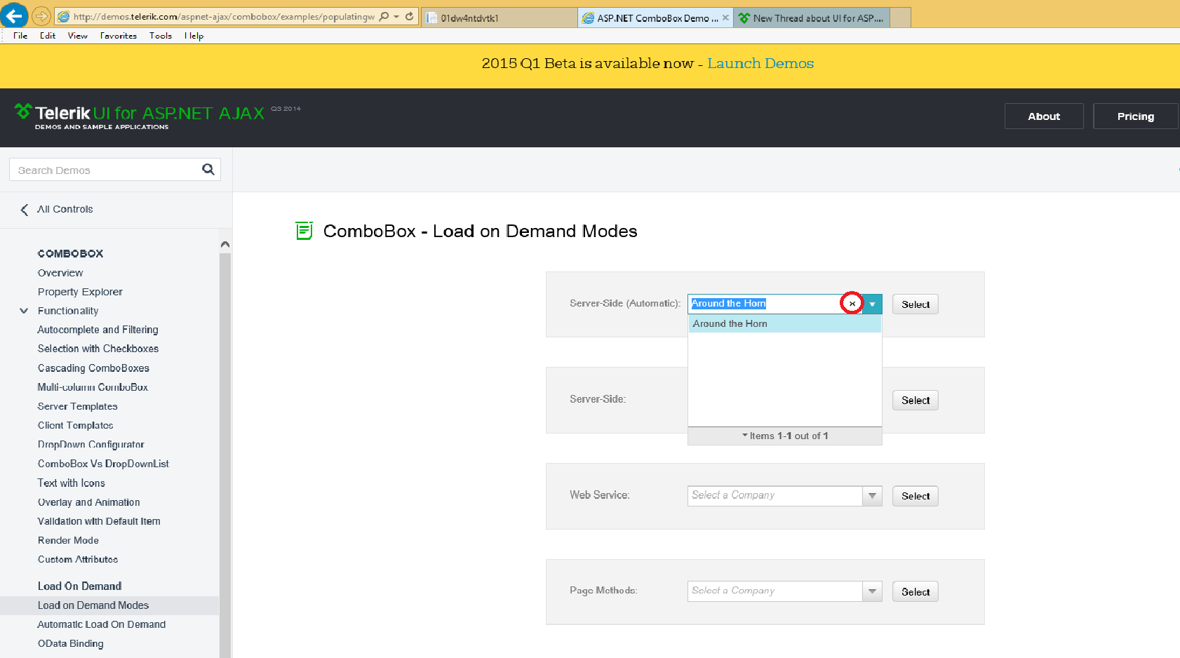 on Server Side (automatic) control, type "Around" it filters the items now select item "Around the Horn" and then click outside the control. Now again click on the RadComboBox control now drop down shows only one item which is selected. Now click on the 'X' mark which shows up on the textbox as shown in the attachment, it clears the search text but items will not be refreshed/request items event is not firing. after that click outside again it will sets before value back again.