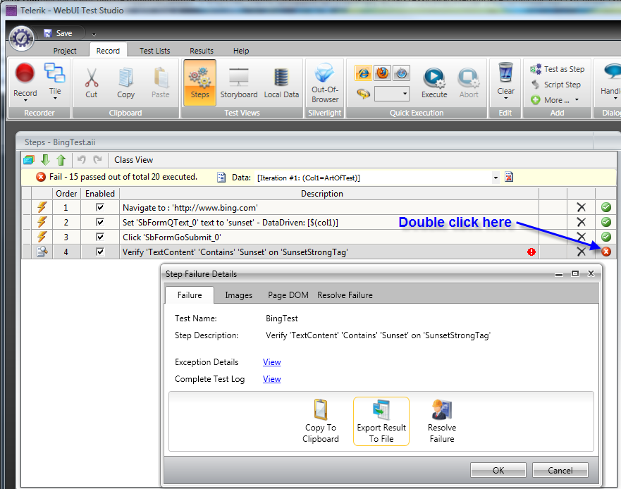The next best is for you to send us a video of you recording and executing your test. Jing is a good and free screen recorder. We also need the exported test results after the test failed for analysis.