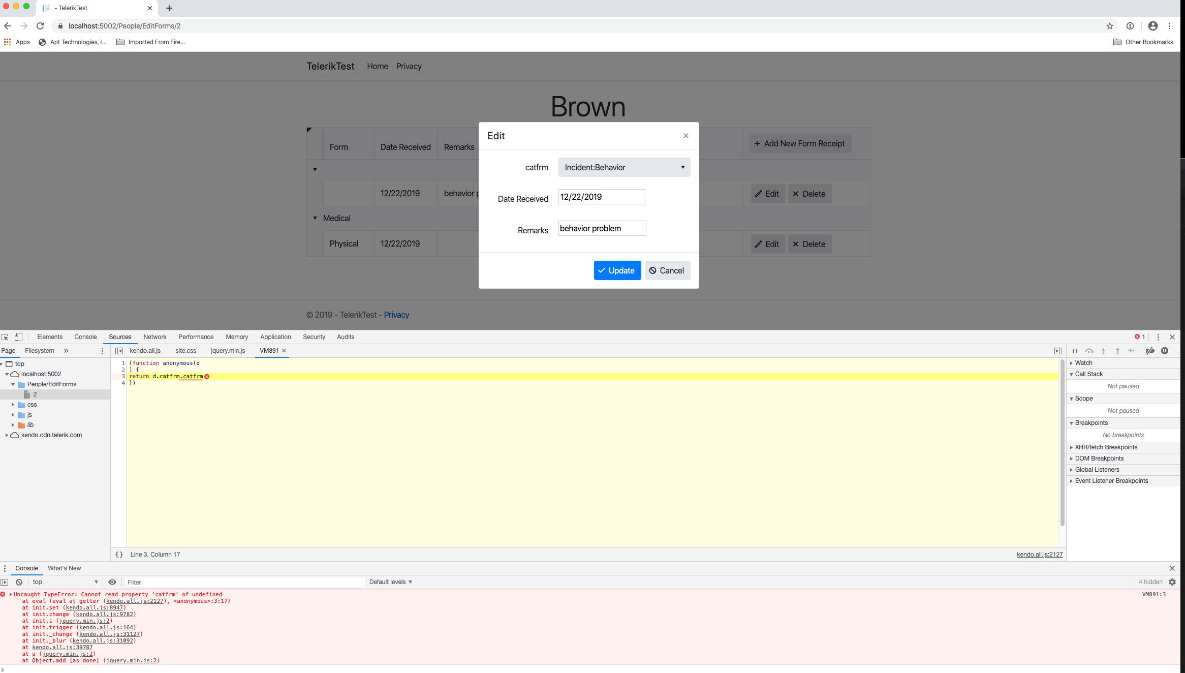 Clicking on item in DropDownList in a Grid Popup Editor causes a javascript "undefined" error. Attached are screen shots from the Chrome debugger. Relevant code is below: