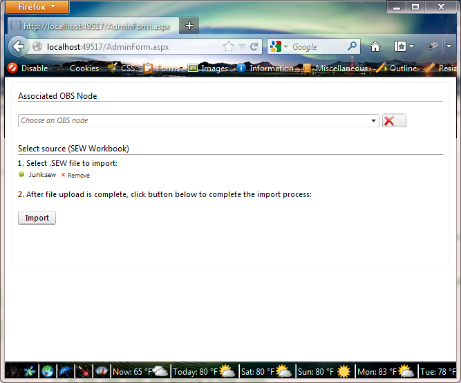 <%@ Page Language="C#" AutoEventWireup="true" CodeBehind="AdminForm.aspx.cs" Inherits="AdminApp.AdminForm" %><%@ Register Assembly="Telerik.Web.UI" Namespace="Telerik.Web.UI" TagPrefix="telerik" %><!DOCTYPE html PUBLIC "-//W3C//DTD XHTML 1.0 Transitional//EN" "http://www.w3.org/TR/xhtml1/DTD/xhtml1-transitional.dtd"><html xmlns="http://www.w3.org/1999/xhtml"><head id="Head1" runat="server"> <title></title></head><body> <form id="form1" runat="server"> <telerik:RadScriptManager ID="MasterScriptManager" runat="server" EnablePageMethods="true" /> <telerik:RadFormDecorator ID="FormDecorator1" runat="server" DecoratedControls="All"> </telerik:RadFormDecorator> <fieldset id="importSmpTable"> <div class="formCol"> <br /> You may configure a user with primary responsibility for the imported project. You may also assign the project to an OBS node. Note that if you assign the project to another user AND an OBS mode to which you have no access, the project will not be visible to you after import. <h5> Associated OBS Node</h5> <br /> <telerik:RadComboBox ID="ddlObs" runat="server" Width="85%" ShowToggleImage="True" ToolTip="Select a node from the Organization Breakdown Structure." Style="vertical-align: middle;" OnClientDropDownOpened="OnClientDropDownOpenedHandler" EmptyMessage="Choose an OBS node" ExpandAnimation-Type="None" CollapseAnimation-Type="None"> <ItemTemplate> <div id="div1"> <telerik:RadTreeView runat="server" ID="treeviewObs" OnClientNodeClicking="nodeClicking" Width="100%" Height="140px"> </telerik:RadTreeView> </div> </ItemTemplate> <Items> <telerik:RadComboBoxItem Text="" /> </Items> </telerik:RadComboBox> <telerik:RadButton ID="btnClearObs" runat="server" Text="" OnClientClicked="btnClearObs_Click" ToolTip="Clear Associated OBS setting"> <Icon PrimaryIconCssClass="rbRemove" PrimaryIconLeft="4" PrimaryIconTop="4" /> </telerik:RadButton> <br /> <asp:CheckBox ID="chkHigherNodes" runat="server" Text="Grant access to nodes higher than the selected OBS node." Checked="true" /> <br /> <br /> <br /> <h5> <asp:Label ID="lblPrimaryResponsibility" runat="server" AssociatedControlID="ddlPrimaryResponsibility" Text="Assign primary responsibility" /> </h5> <br /> <div> <telerik:RadComboBox ID="ddlPrimaryResponsibility" runat="server" Width="80%" ToolTip="Select a user to have the primary responsibility for this estimation project." /> </div> <br /> <br /> </div> <div class="formCol" style="padding-right: 10px;"> <h5> <asp:Label ID="lblSelect" runat="server" Text="Select source (SEW Workbook)" /> </h5> <div class="upload-panel"> <h6> 1. Select .SEW file to import:</h6> <telerik:RadAsyncUpload ID="UploadControl" runat="server" MaxFileInputsCount="1" AllowedFileExtensions="sew" PostbackTriggers="ImportButton" /> <%----%> </div> <telerik:RadProgressManager ID="RadProgressManager1" runat="server" /> <h6> 2. After file upload is complete, click button below to complete the import process:</h6> <br /> <telerik:RadButton ID="ImportButton" runat="server" Text="Import SLIM-Estimate Project" OnClick="OnImport" /> <br /> <br /> <br /> <p> <asp:Label ID="Notification" runat="server" CssClass="failureNotification boldError" /></p> </div> <script type="text/javascript"> var isError = <%=IsError.ToString().ToLower()%>; var errorMessage = "<%=ErrorMessage%>"; if(isError) { alert(errorMessage); } function btnClearObs_Click( sender, eventArgs ) { var ddl = $find( "<%= ddlObs.ClientID %>" ); ddl.set_text( "" ); ddl.trackChanges(); ddl.get_items().getItem( 0 ).set_text( "" ); ddl.commitChanges(); var tree = ddl.get_items().getItem( 0 ).findControl( "treeviewObs" ); var selectedNode = tree.get_selectedNode(); if ( selectedNode != null ) selectedNode.set_selected( false ); } function nodeClicking( sender, args ) { var comboBox = $find( "<%= ddlObs.ClientID %>" ); var node = args.get_node(); comboBox.set_text( node.get_text() ); comboBox.trackChanges(); comboBox.get_items().getItem( 0 ).set_text( node.get_text() ); comboBox.commitChanges(); comboBox.hideDropDown(); } //find the selected node in the treeview inside the combobox and scroll it into view function OnClientDropDownOpenedHandler( sender, eventArgs ) { var tree = sender.get_items().getItem( 0 ).findControl( "rtvObs" ); var selectedNode = tree.get_selectedNode(); if ( selectedNode ) { selectedNode.scrollIntoView(); } } </script> </fieldset> </form></body></html>/*************************************** AdminForm.aspx.cs ****************************************************/