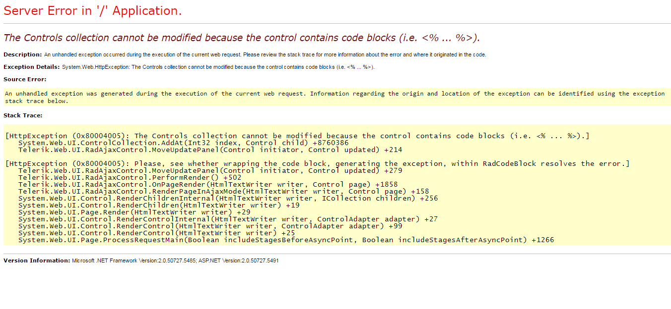 Could you please specify what exactly is the issue that you are experiencing. If it is the error thrown like at the Alex' end, you might consider avoiding placing javascript logic in the title of your page. The other option is to implement the same as Alex did - wrap the code in RadCodeBlock:
