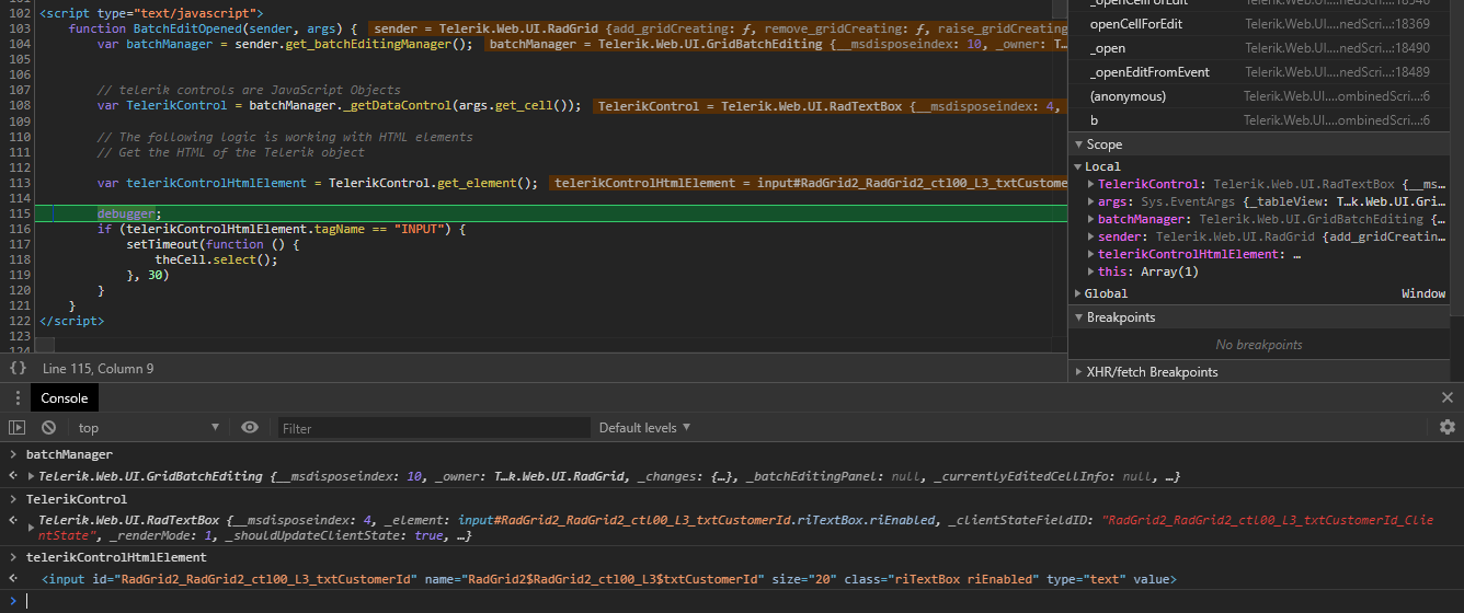 <telerik:RadCodeBlock runat="server"> <script type="text/javascript"> function BatchEditOpened(sender, args) { var batchManager = sender.get_batchEditingManager(); var theCell = batchManager._getDataControl(args.get_row(), args.get_columnUniqueName()); if (theCell.tagName == "INPUT") { setTimeout(function () { theCell.select(); }, 30) } } </script></telerik:RadCodeBlock><telerik:RadGrid RenderMode="Lightweight" ID="RadGrid2" runat="server" ShowStatusBar="true" OnNeedDataSource="RadGrid2_NeedDataSource" OnInsertCommand="RadGrid2_InsertCommand" OnUpdateCommand="RadGrid2_UpdateCommand" OnDeleteCommand="RadGrid2_DeleteCommand"> <MasterTableView AutoGenerateColumns="false" DataKeyNames="CustomerID" EditMode="Batch" CommandItemDisplay="Top"> <Columns> <telerik:GridTemplateColumn HeaderStyle-Width="50px" AllowSorting="true" SortExpression="CustomerID" ItemStyle-BorderColor="Black" ItemStyle-BorderStyle="Solid" ItemStyle-BorderWidth="0.5px" HeaderText="L3" UniqueName="L3" ItemStyle-CssClass="rgRightItem" HeaderStyle-CssClass="rgCenterHeader"> <ItemTemplate> <asp:Label runat="server" ID="lblCustomerId" Text='<%# Eval("CustomerID") %>'></asp:Label> </ItemTemplate> <EditItemTemplate> <asp:TextBox runat="server" ID="txtCustomerId" Text='<%# Eval("CustomerID") %>'></asp:TextBox> </EditItemTemplate> </telerik:GridTemplateColumn> <telerik:GridTemplateColumn HeaderStyle-Width="175px" AllowSorting="true" SortExpression="ContactName" HeaderText="Contact Name Header" UniqueName="ContactName" SortedBackColor="LemonChiffon" ItemStyle-CssClass="rgLeftItem" HeaderStyle-CssClass="rgLeftHeader"> <ItemTemplate> <asp:Label runat="server" ID="lblContactName" Text='<%# Eval("ContactName") %>'></asp:Label> </ItemTemplate> <EditItemTemplate> <telerik:RadComboBox runat="server" ID="editContactName" EnableLoadOnDemand="True" DataTextField="ContactName" OnItemsRequested="editContactName_ItemsRequested" DataValueField="ID" HighlightTemplatedItems="true" Height="140px" DropDownAutoWidth="Enabled" Sort="Ascending"> </telerik:RadComboBox> </EditItemTemplate> </telerik:GridTemplateColumn> </Columns> </MasterTableView> <ClientSettings> <ClientEvents OnBatchEditOpened="BatchEditOpened" /> </ClientSettings></telerik:RadGrid>