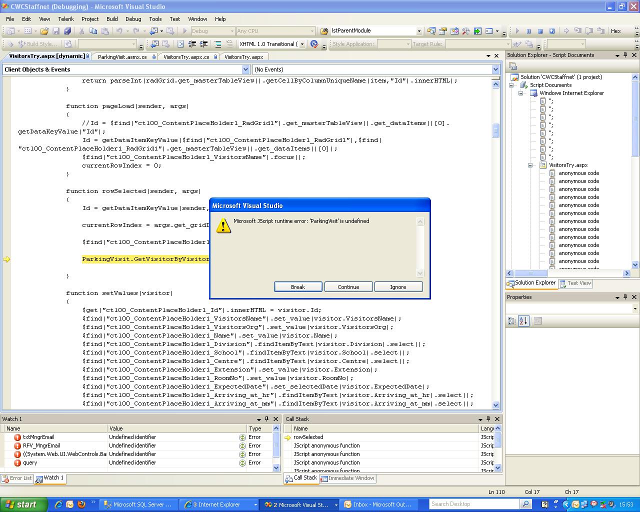 Also the same error comes up for Add new record.Basically I can see it cannot find the ParkingVisit.asmx file.