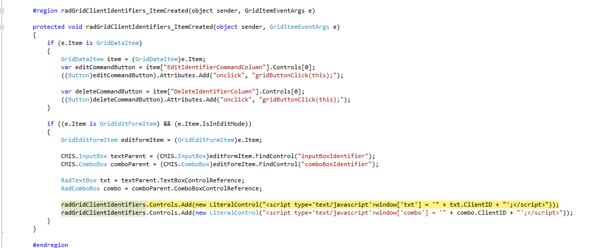 protected void radGridClientIdentifiers_ItemCreated(object sender, GridItemEventArgs e) { if ((e.Item is GridEditFormItem) && (e.Item.IsInEditMode)) { GridEditFormItem editFormItem = (GridEditFormItem)e.Item; CMIS.InputBox textParent = (CMIS.InputBox)editFormItem.FindControl("inputBoxIdentifier"); CMIS.ComboBox comboParent = (CMIS.ComboBox)editFormItem.FindControl("comboBoxIdentifier"); RadTextBox txt = textParent.TextBoxControlReference; RadComboBox combo = comboParent.ComboBoxControlReference; radGridClientIdentifiers.Controls.Add(new LiteralControl("<script type='text/javascript'>window['txt1'] = '" + txt.ClientID + "';</script>")); radGridClientIdentifiers.Controls.Add(new LiteralControl("<script type='text/javascript'>window['combo'] = '" + combo.ClientID + "';</script>")); } }This appears to work fine. However, when we reference them in javascript, the references are null: