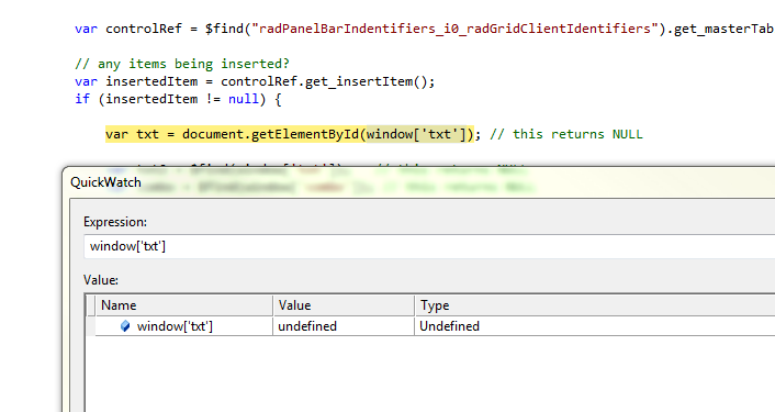 I was asking if, when you select window['txt'] and open the Quick Watch dialog, there is a value returned that corresponds to the ClientID of the searched control.