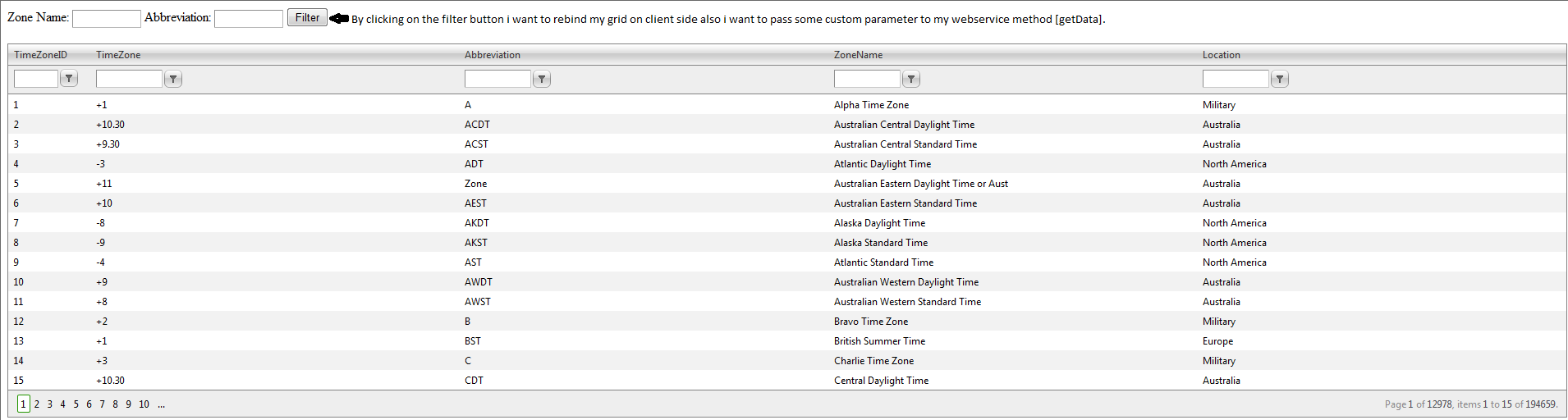 I am trying to use client side binding of Rad Grid as demonstrated on the following link http://demos.telerik.com/aspnet-ajax/grid/examples/client/declarativedatabinding/defaultcs.aspx. My scenario is a bit different from this one. I want to pass in some 4-5 extra arguments to my web service method from the top level filter controls (not column level filter) on top of the page and then I want to rebind my grid by making an asynchronous call to my web service on a button click without a postback.