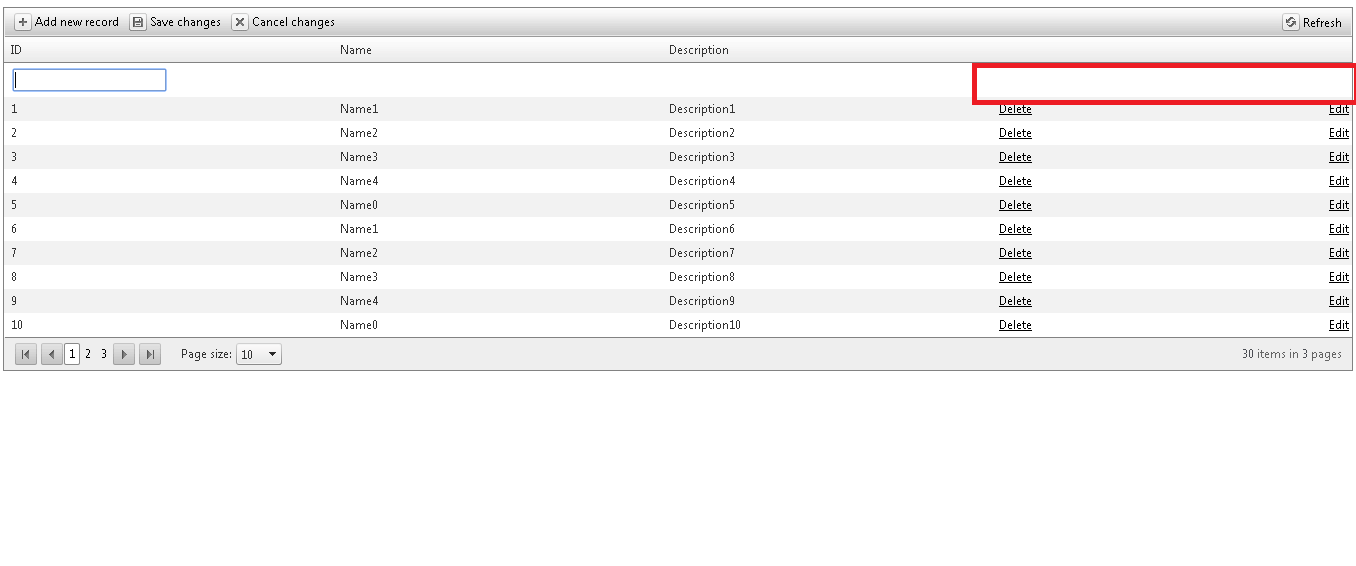 When you click on "Add new record", it gives you the option to enter details. But it doesn't show the Delete/Edit columns. And once you added the new row, it doesn't show the delete/edit links. (Screenshot attached as well)
