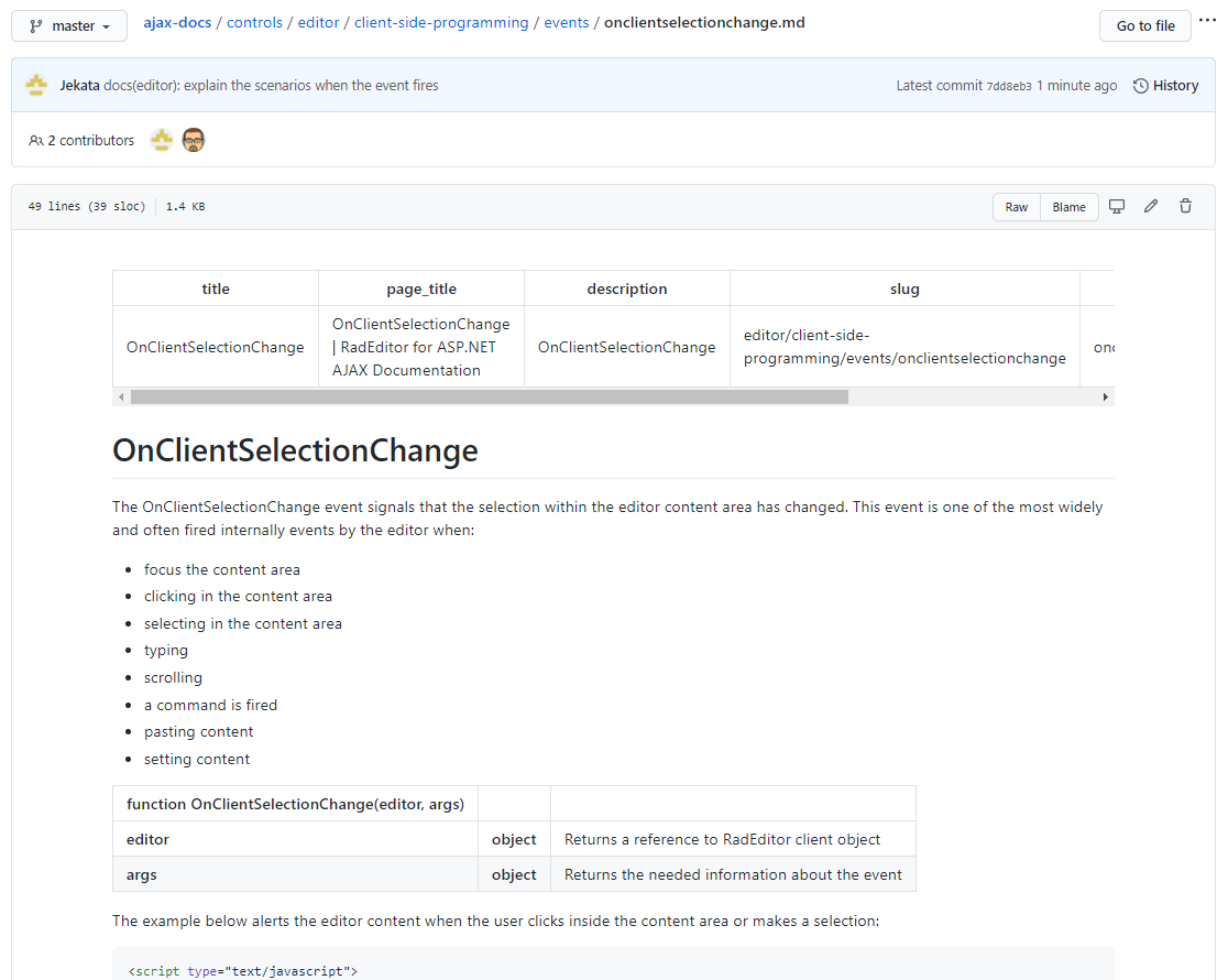 The documentation indicates that the ClientSelectionChange event will be raised whenever the user changes selection "within the ContentArea." I'm finding that the event is raised whenever the mouse is clicked anywhere, e.g. srollbar, toolbar, etc. Is this expected behavior, or am I missing something? In the project below, set a breakpoint in the ClientSelectionChange event handler. Click on "Some Content", breakpoint is hit as expected. Now click on Scrollbar. Breakpoint is hit again, even though the selected element remains "Some Content". This is unexpected.