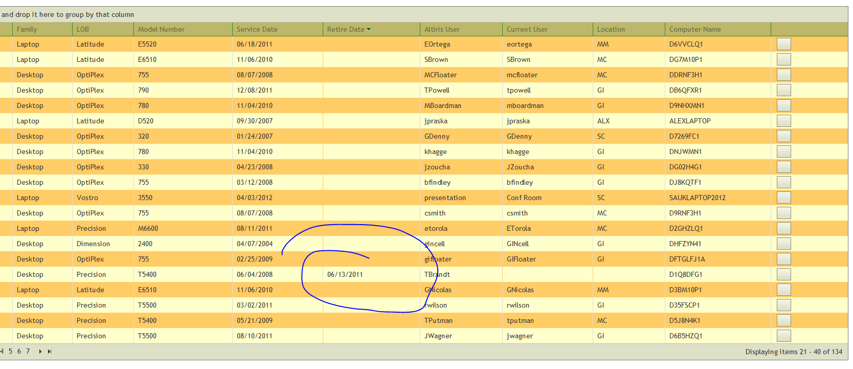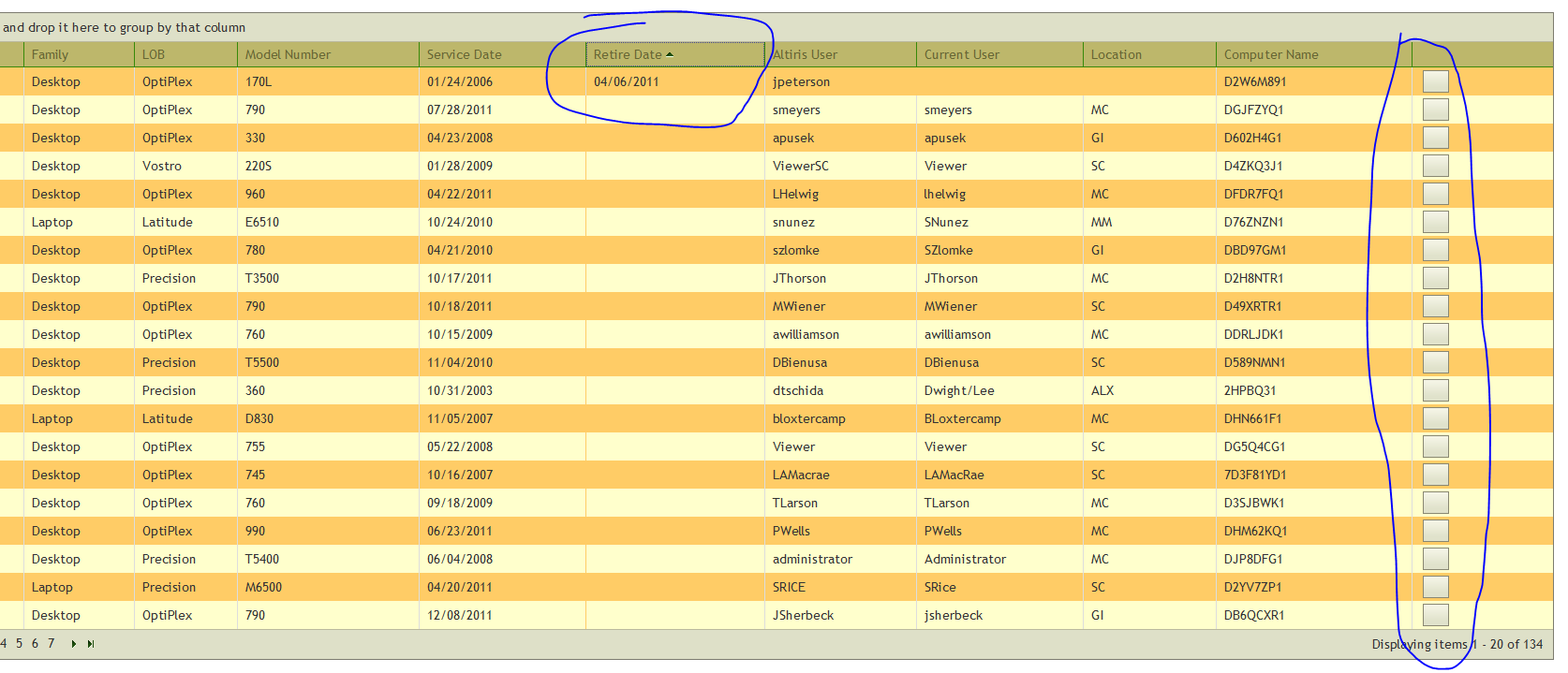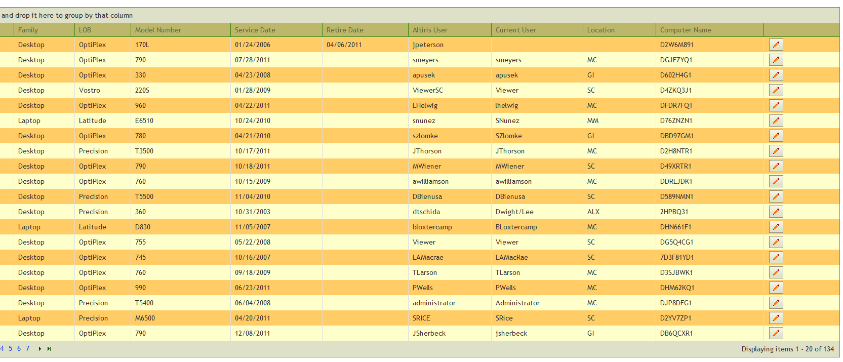 @(Html.Telerik().Grid(Model).Name("DellGrid").DataKeys(keys => keys.Add(m => m.ServiceTag)).DataBinding(dataBinding => dataBinding.Ajax() .OperationMode(GridOperationMode.Client) .Select("Index", "DellSystem") .Update("Edit", "DellSystem")).Columns(columns =>{ columns.Bound(m => m.ServiceTag) .Title("Service Tag"); columns.Bound(m => m.Family) .Title("Family"); columns.Bound(m => m.LOB) .Title("LOB"); columns.Bound(m => m.ModelNumber) .Title("Model Number"); columns.Bound(m => m.ServiceDate) .Title("Service Date"); columns.Bound(m => m.RetireDate) .Title("Retire Date"); columns.Bound(m => m.User) .Title("Altiris User"); columns.Bound(m => m.CurrentUser) .Title("Current User"); columns.Bound(m => m.Whse) .Title("Location"); columns.Bound(m => m.Name) .Title("Computer Name"); columns.Command(commands => { commands.Custom("Edit").ButtonType(GridButtonType.Image) .ImageHtmlAttributes(new { @class = "t-icon t-edit" }) .Text("Edit") .Action("Edit", "DellSystem"); }).Width(150);}) .Groupable() .Sortable() .Pageable(page => page.PageSize(20)))Also, when you sort a column, the ImageHtmlAttributes section seems to be lost as I lose my icon for the edit button: