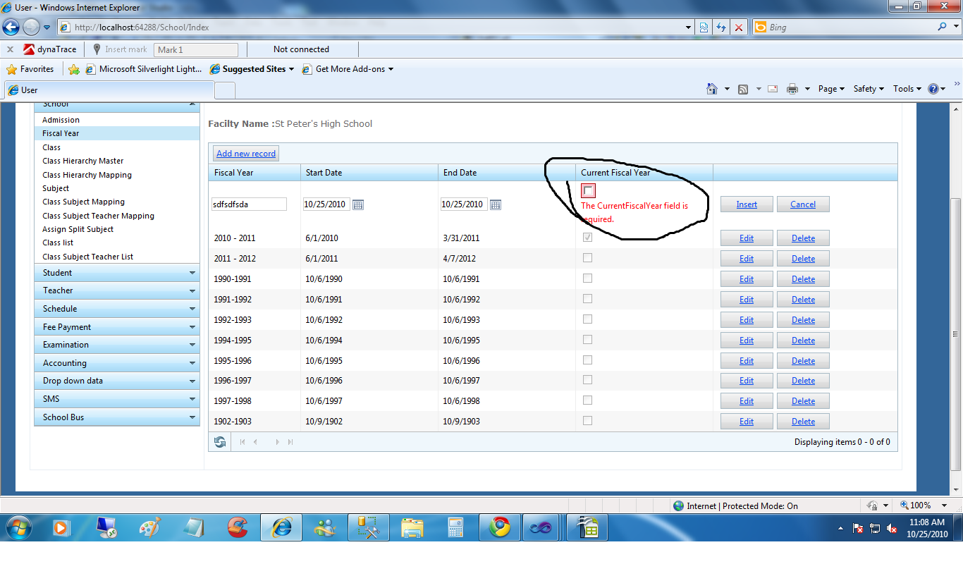 my source code <%= Html.Telerik() .Grid<SAMA.DataModels.Common.FiscalYear>() .Name("FiscalYearGrid") .ToolBar(tbar => tbar.Insert().HtmlAttributes(new { @style = ((Permission)ViewData["CRUD"]).Insert ? "" : "display:none;" })) .DataKeys(keys => keys.Add(o => o.FiscalYearID).RouteKey("fiscalYearID")) .ClientEvents(events => events.OnError("OnTelerikError")) .DataBinding(dataBinding => dataBinding.Ajax() .Select("FiscalYearDetail", "School") .Insert("FiscalYear_Insert", "School") .Update("FiscalYear_Update", "School") .Delete("FiscalYear_Delete", "School")) .Columns(columns => { columns.Bound(o => o.Fiscal_Year).Title("Fiscal Year").Width(100); columns.Bound(o => o.StartDate).Width(150); columns.Bound(o => o.EndDate).Width(150); columns.Bound(o => o.CurrentFiscalYear).ClientTemplate("<input id=cfy type=checkbox disabled=true <#=CurrentFiscalYear?'checked':'' #> /> ").Width(150); columns.Command(commands => { commands.Edit().HtmlAttributes(new { @style = ((Permission)ViewData["CRUD"]).Update ? "" : "display:none;" }); commands.Delete().HtmlAttributes(new { @style = ((Permission)ViewData["CRUD"]).Delete ? "" : "display:none;" }); }).Width(200); }) .Editable(editing => editing.Mode(GridEditMode.InLine)) .Pageable() %>fields of grid public class FiscalYear { public int FiscalYearID { get; set; } [Required] [StringLength(128, ErrorMessage="Not More than 128 Charecters")] public string Fiscal_Year { get; set; } [DataType(DataType.Date), Required] public DateTime StartDate { get; set; } [DataType(DataType.Date), Required] public DateTime EndDate { get; set; } public bool CurrentFiscalYear { get; set; } }